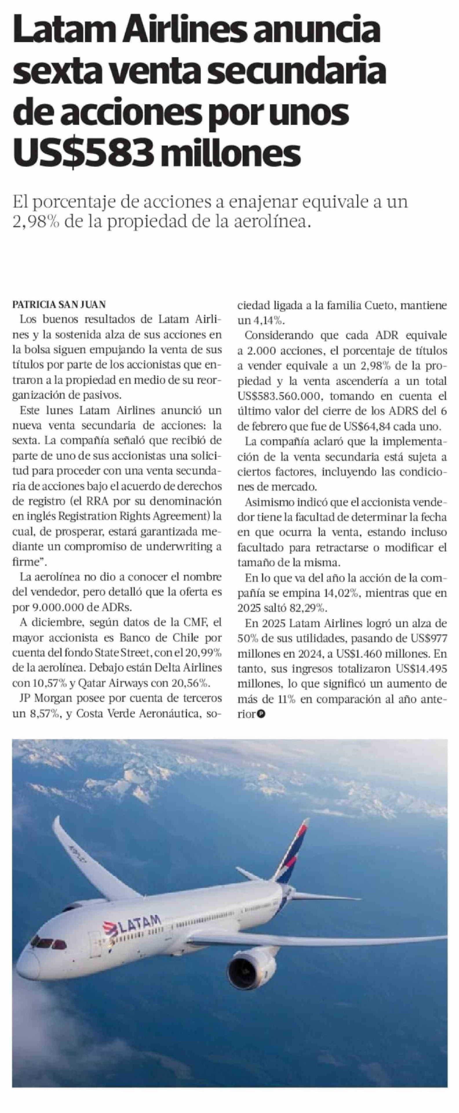 Latam Airlines anuncia sexta venta secundaria de acciones por unos US$583 millones