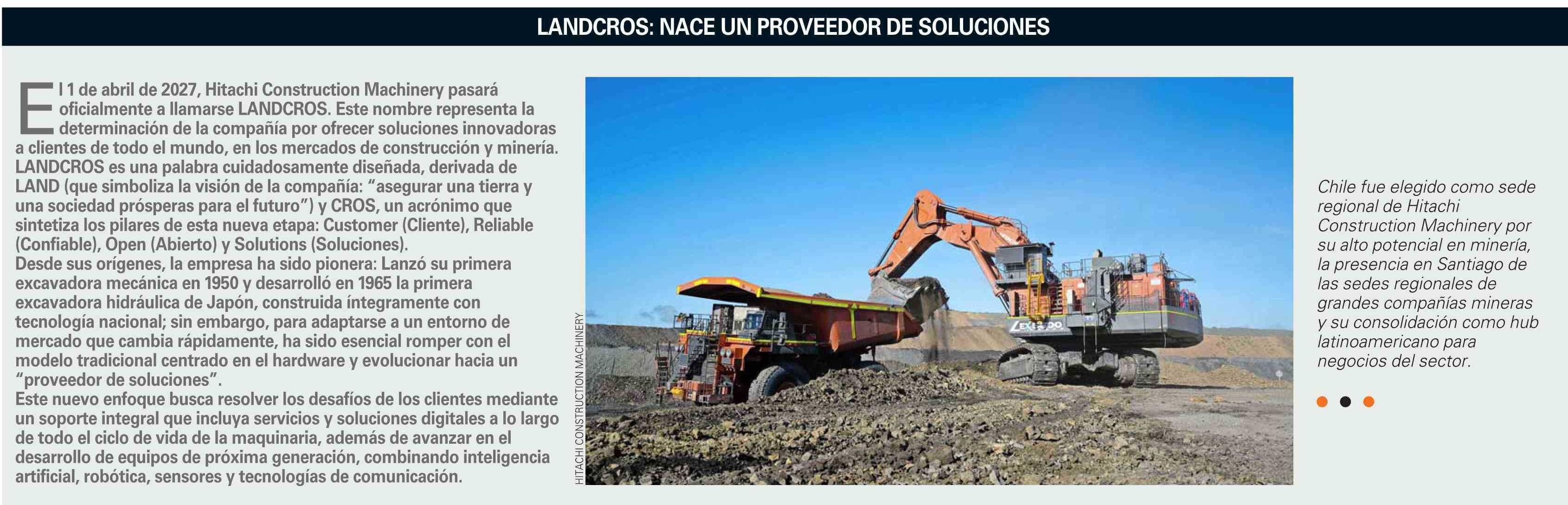 Título: El 1 de abril de 2027, Hitachi Construction Machinery pasará oficialmente a llamarse LANDCROS. Este nombre representa la determinación de la compañía por ofrecer soluciones innovadoras a clientes de todo el mundo, en los mercados de construcción y minería. LANDCROS es una palabra cuidadosamente dise