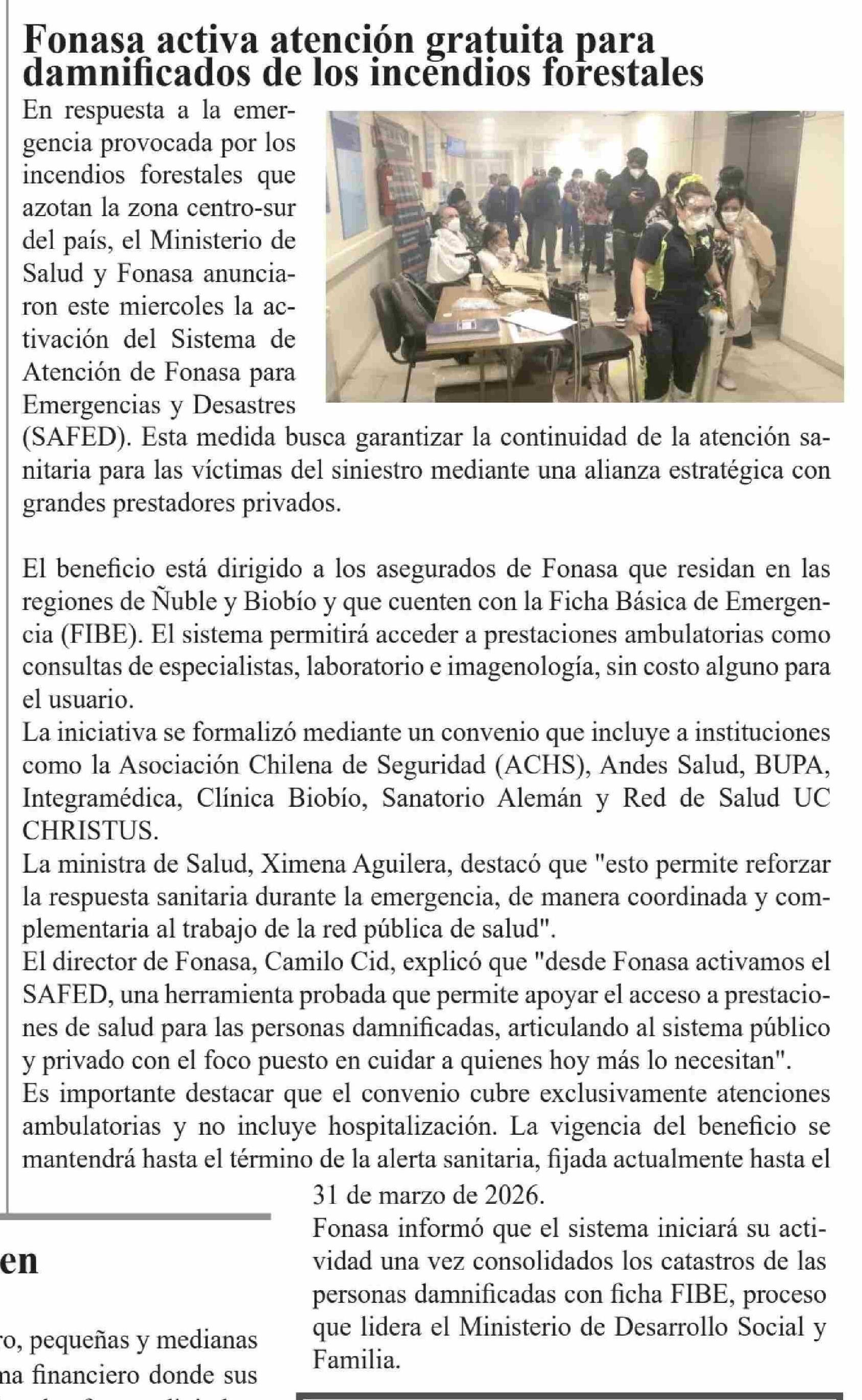 Fonasa activa atención gratuita para damnificados de los incendios forestales