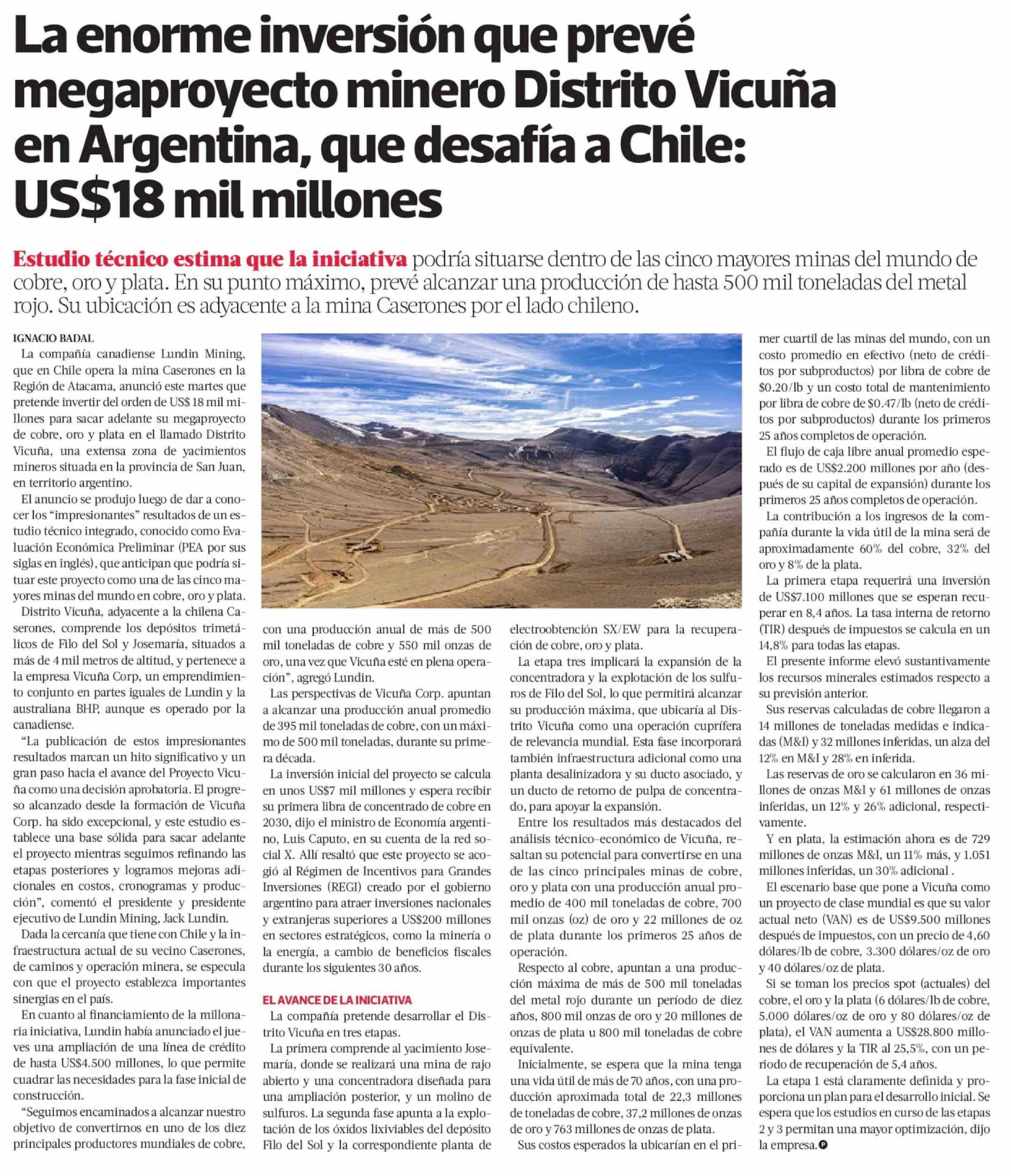 Título: La enorme inversión que prevé megaproyecto minero Distrito Vicuña en Argentina, que desafía a Chile: US$18 mil millones