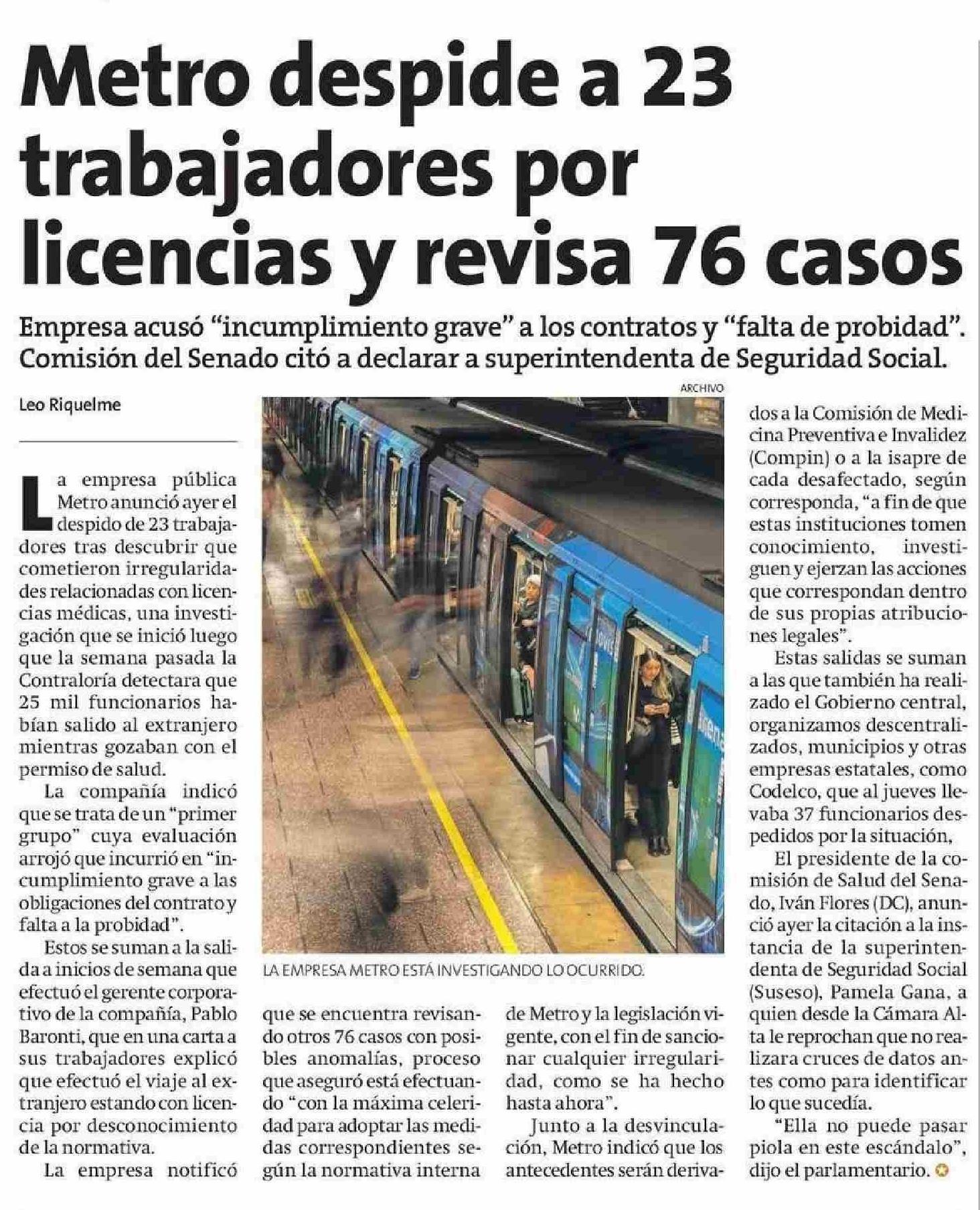 Metro despide a 23 trabajadores por licencias y revisa 76 casos