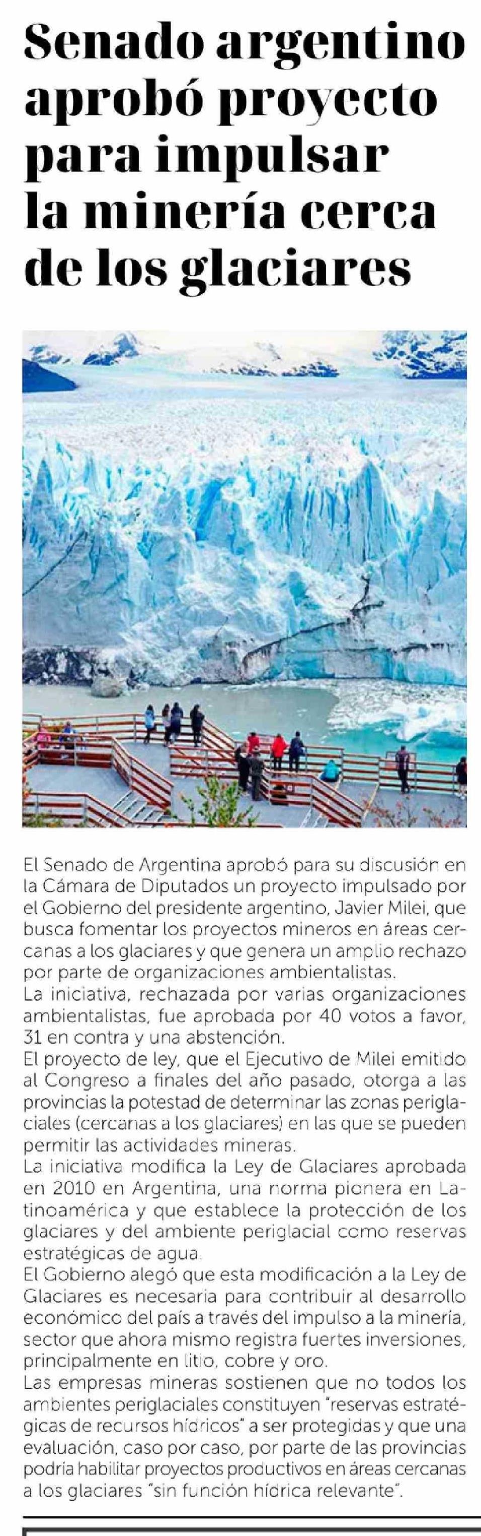 Senado argentino aprobó proyecto para impulsar la minería cerca de los glaciares