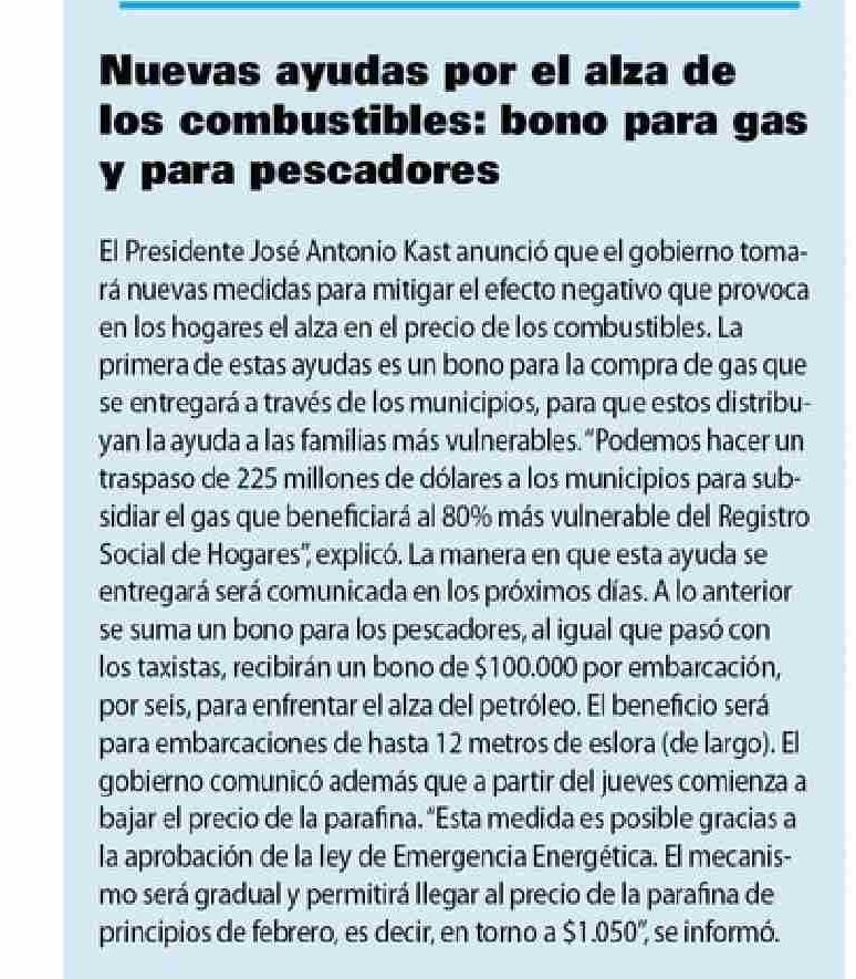 Nuevas ayudas por el alza de los combustibles: bono para gas y para pescadores