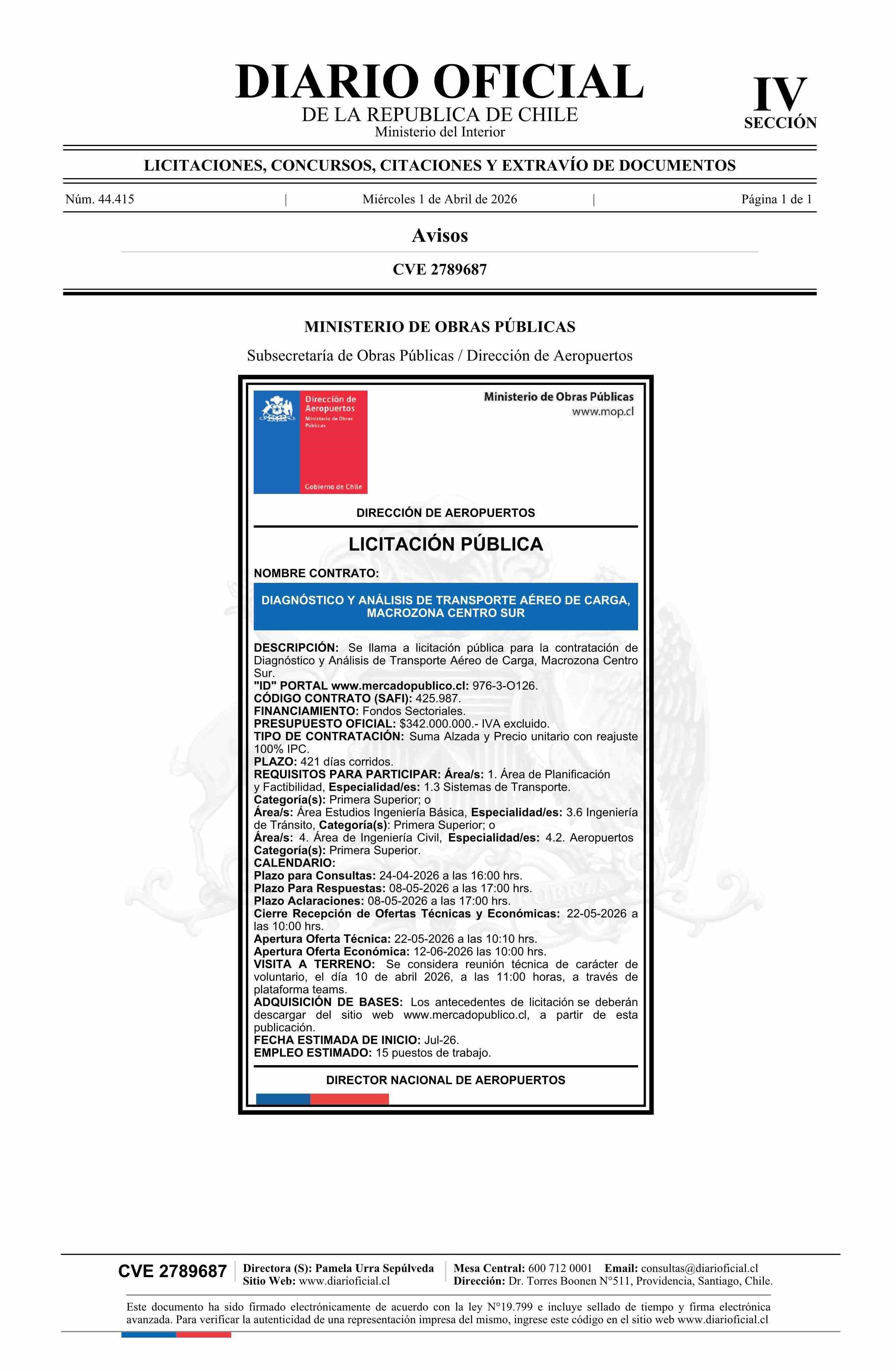 | Título: | AVISO LICITACIONES: Diagnóstico y Análisis de Transporte Aéreo de Carga, Macrozona Centro Sur |