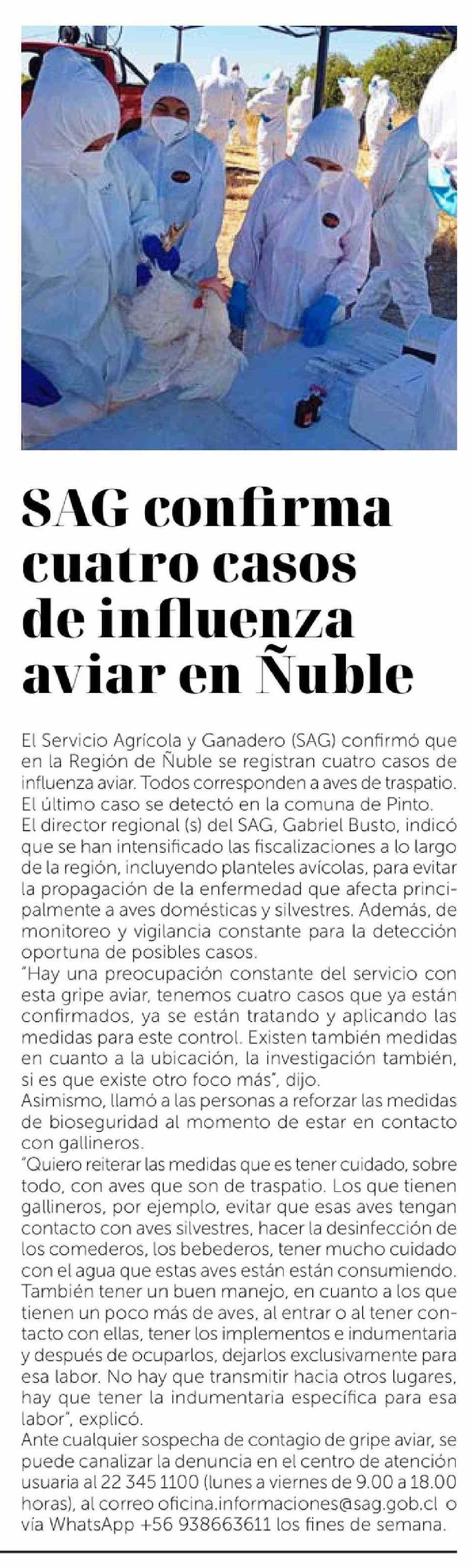 SAG confirma cuatro casos de influenza aviar en Ñuble