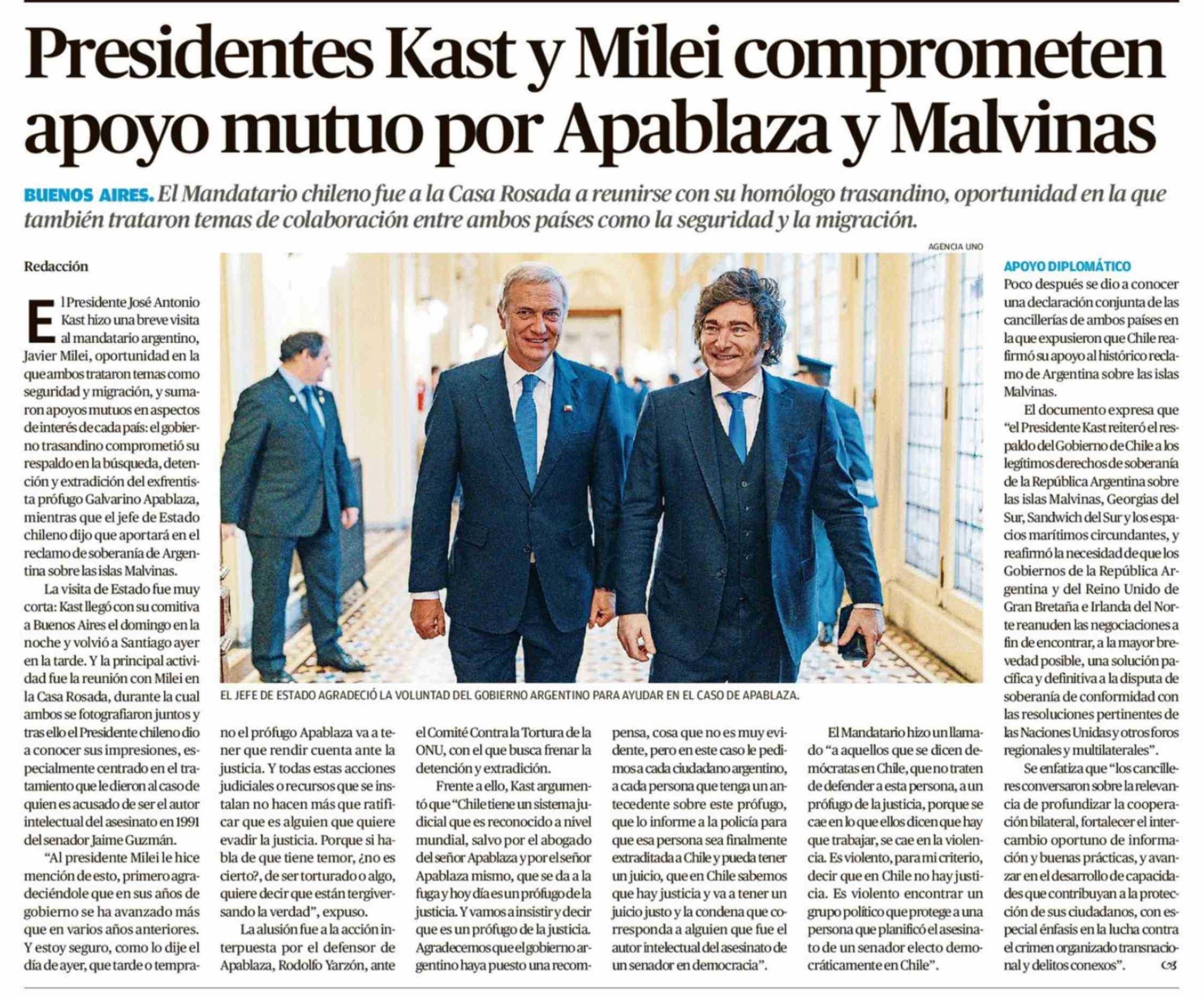 Presidentes Kast y Milei comprometen apoyo mutuo por Apablaza y Malvinas