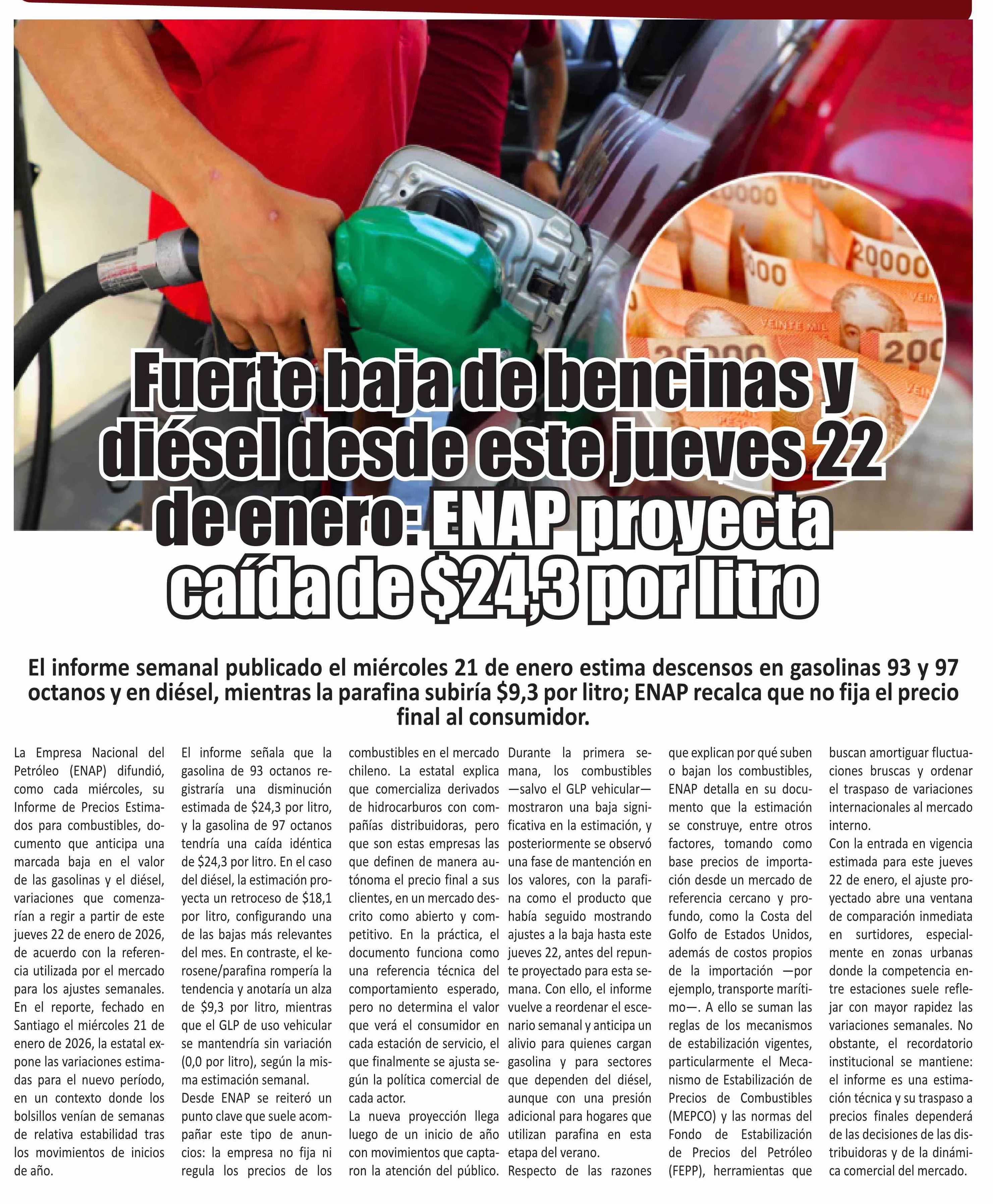 Fuerte baja de bencinas y diésel desde este jueves 22 de enero: ENAP proyecta caída de $24,3 por litro