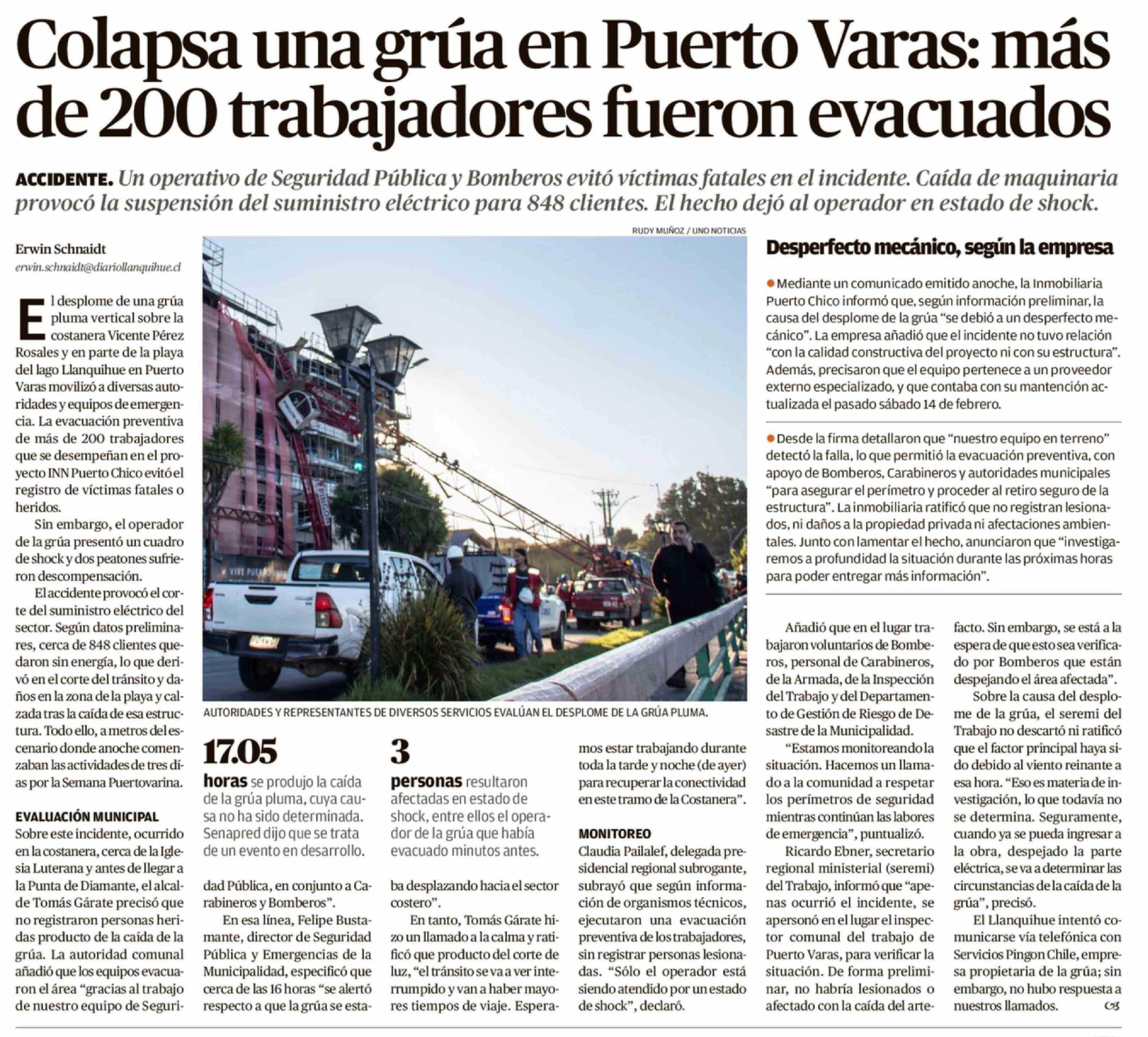 Colapsa una grúa en Puerto Varas: más de 200 trabajadores fueron evacuados