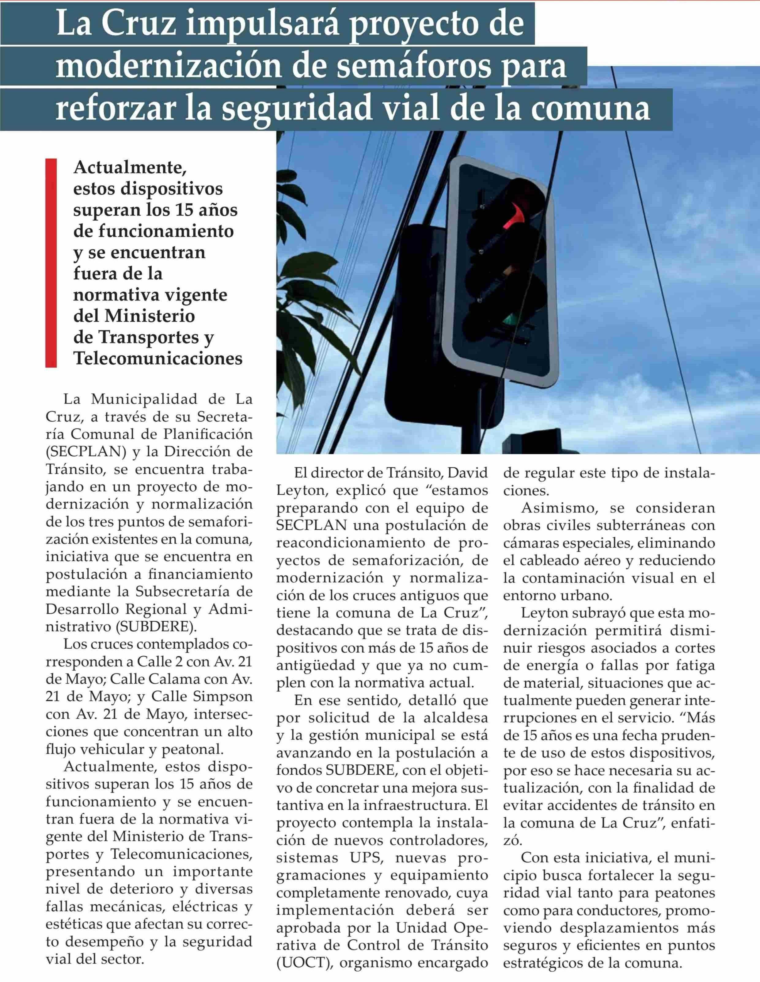 La Cruz impulsará pnyecto de modernización de semáforos para reforzar la seguridad vial de la comuna