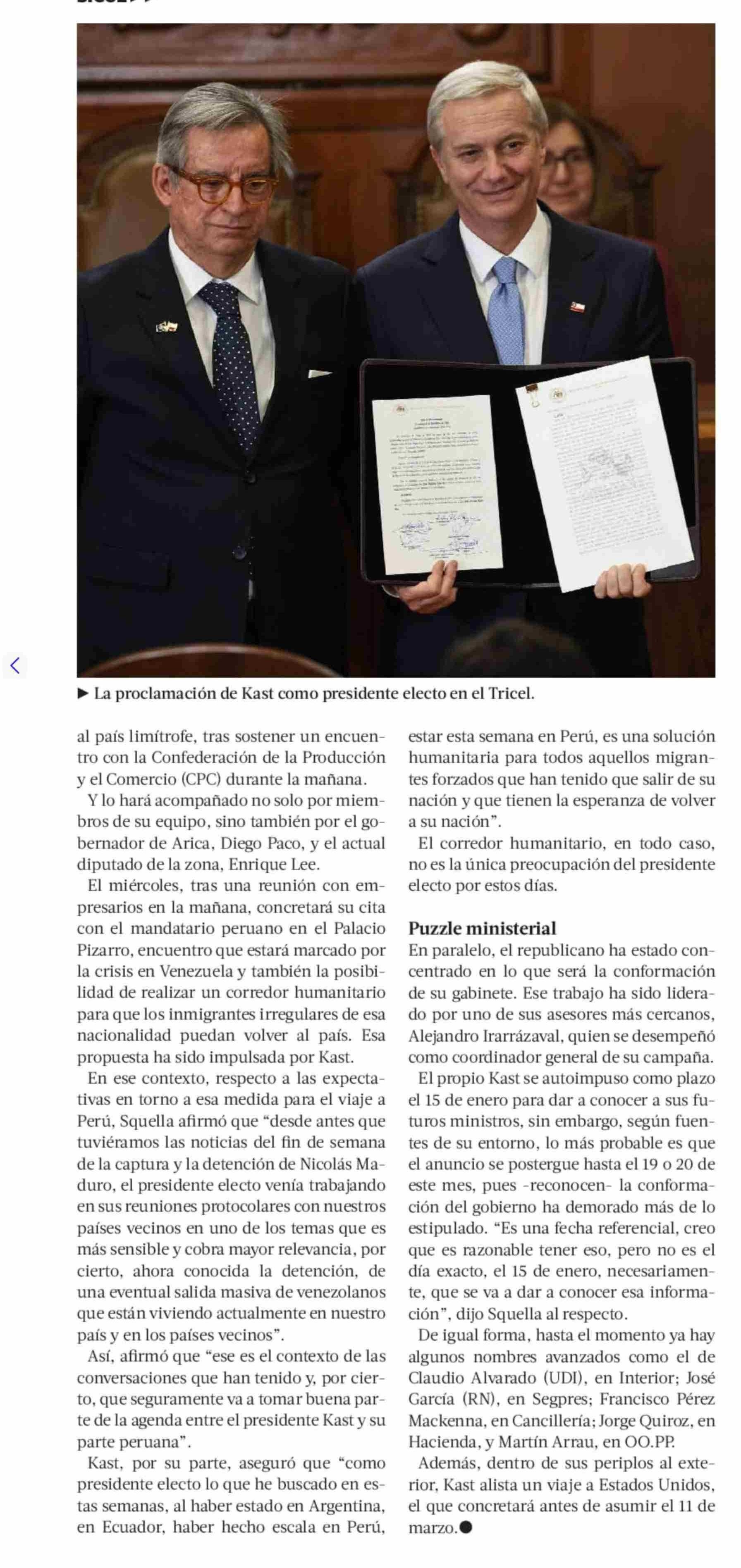 Tricel proclama a Kast como presidente electo y afina detalles de viaje a Perú