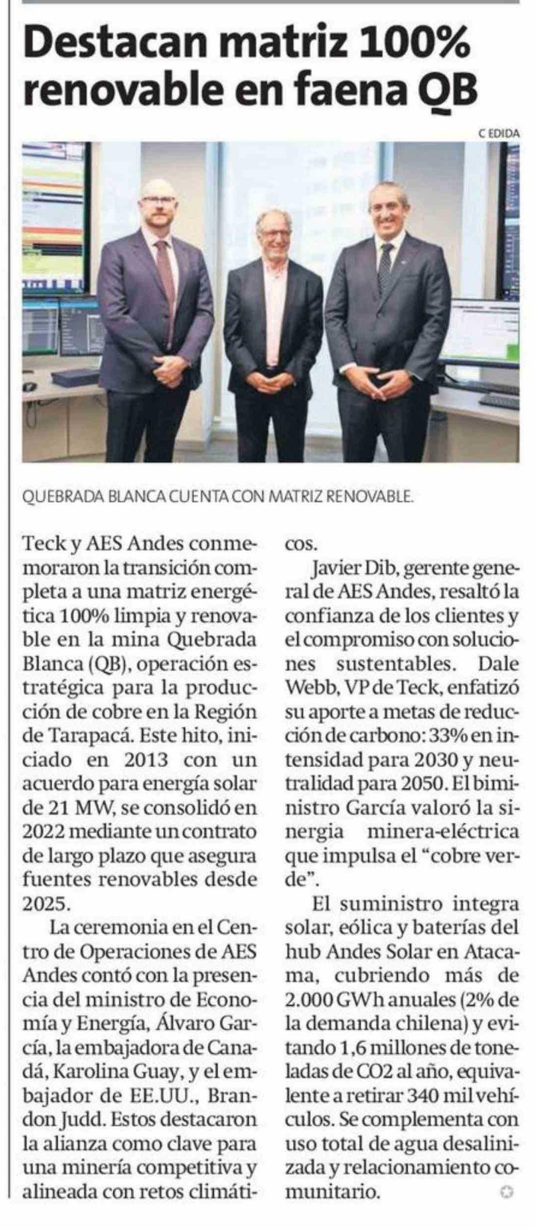 Destacan matriz 100% renovable en faena QB