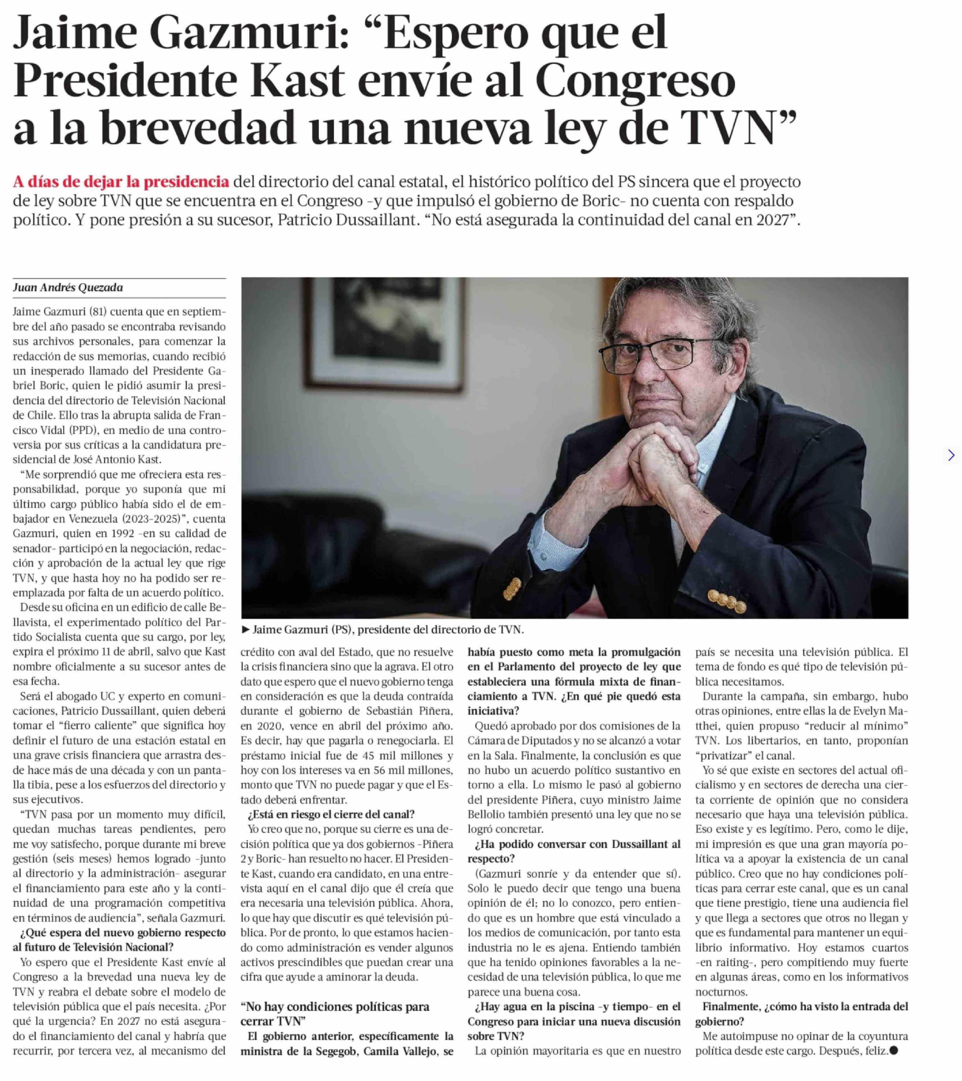 Jaime Gazmuri: "Espero que el Presidente Kast envíe al Congreso a la brevedad una nueva ley de TVN"