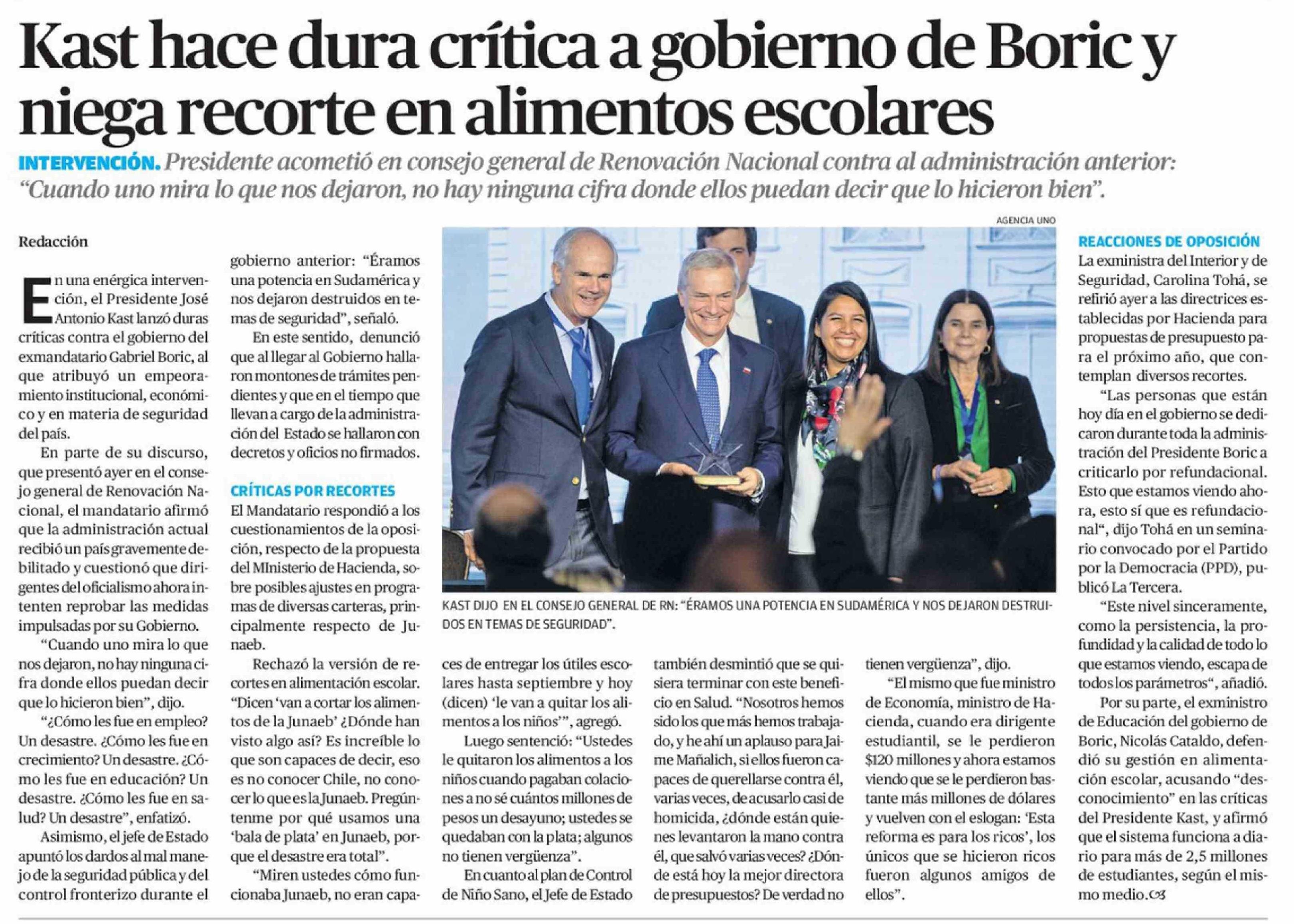 Kast hace dura crítica a gobierno de Boric y niega recorte en alimentos escolares