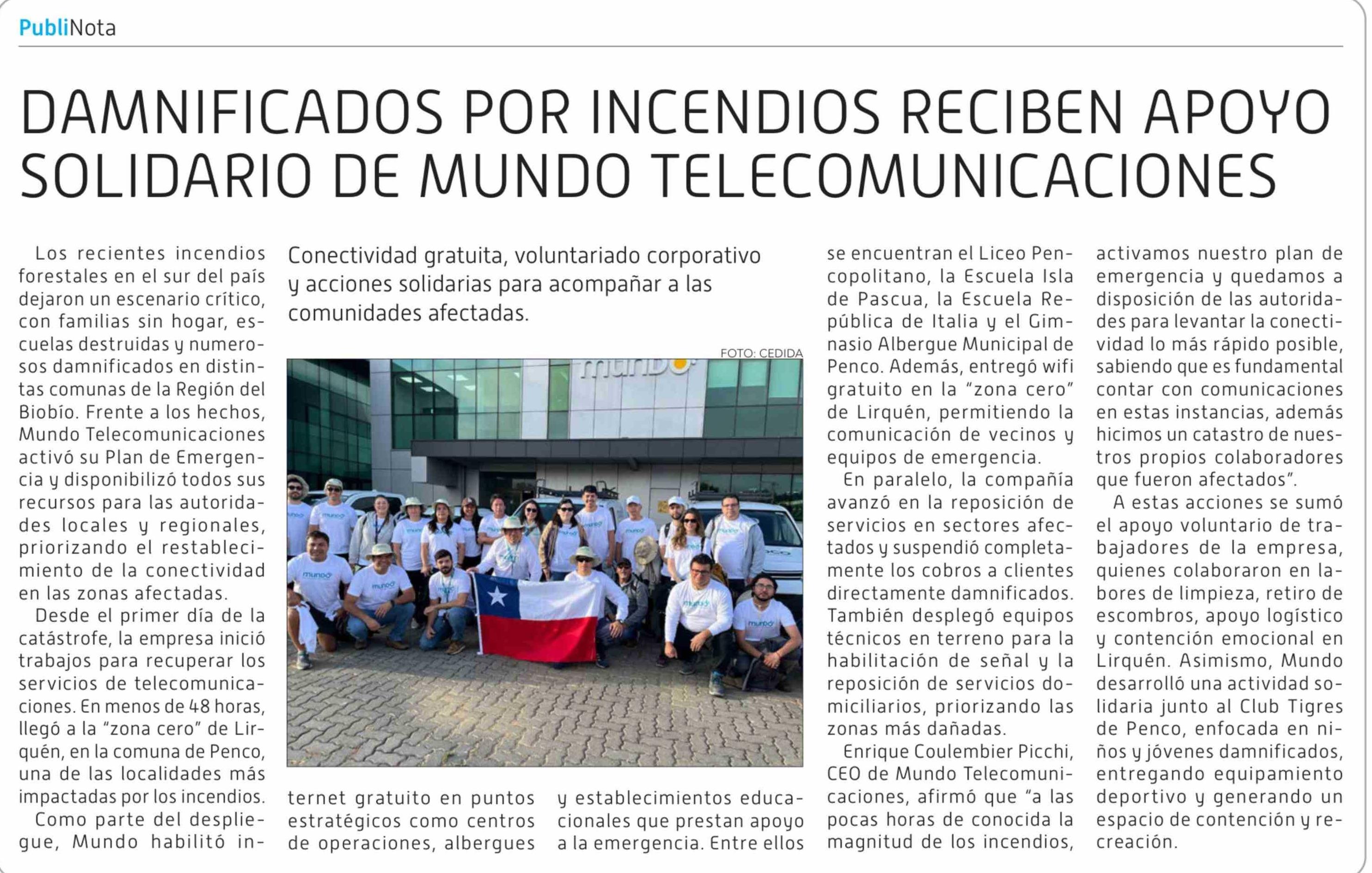 DAMNIFICADOS POR INCENDIOS RECIBEN APOYO SOLIDARIO DE MUNDO TELECOMUNICACIONES