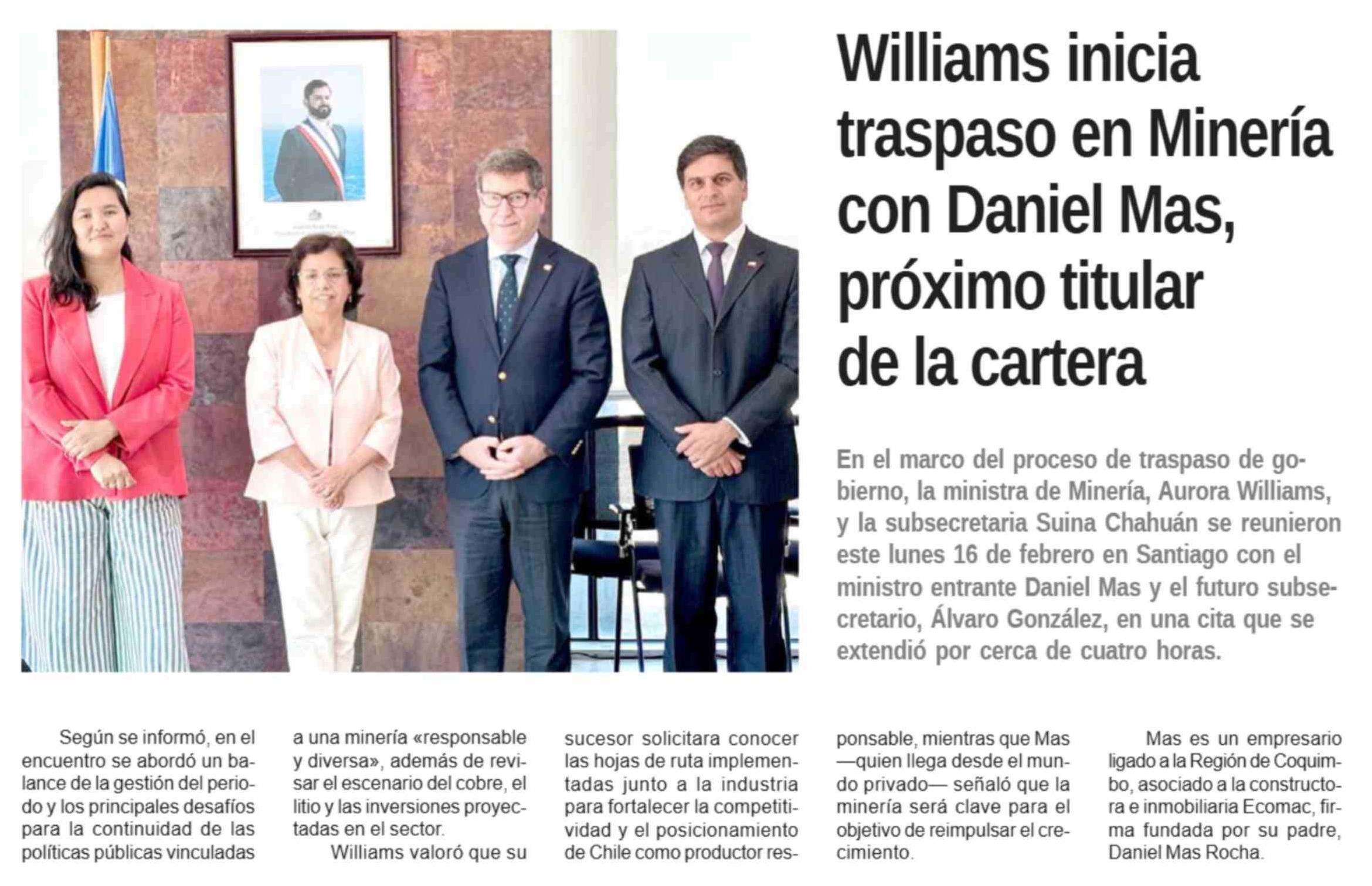 Williams inicia traspaso en Minería con Daniel Mas, próximo titular de la cartera