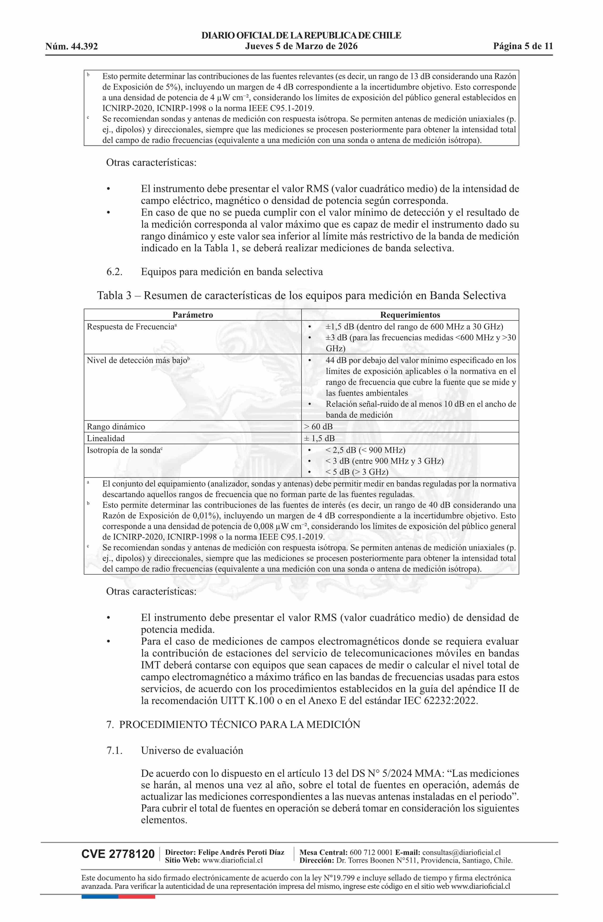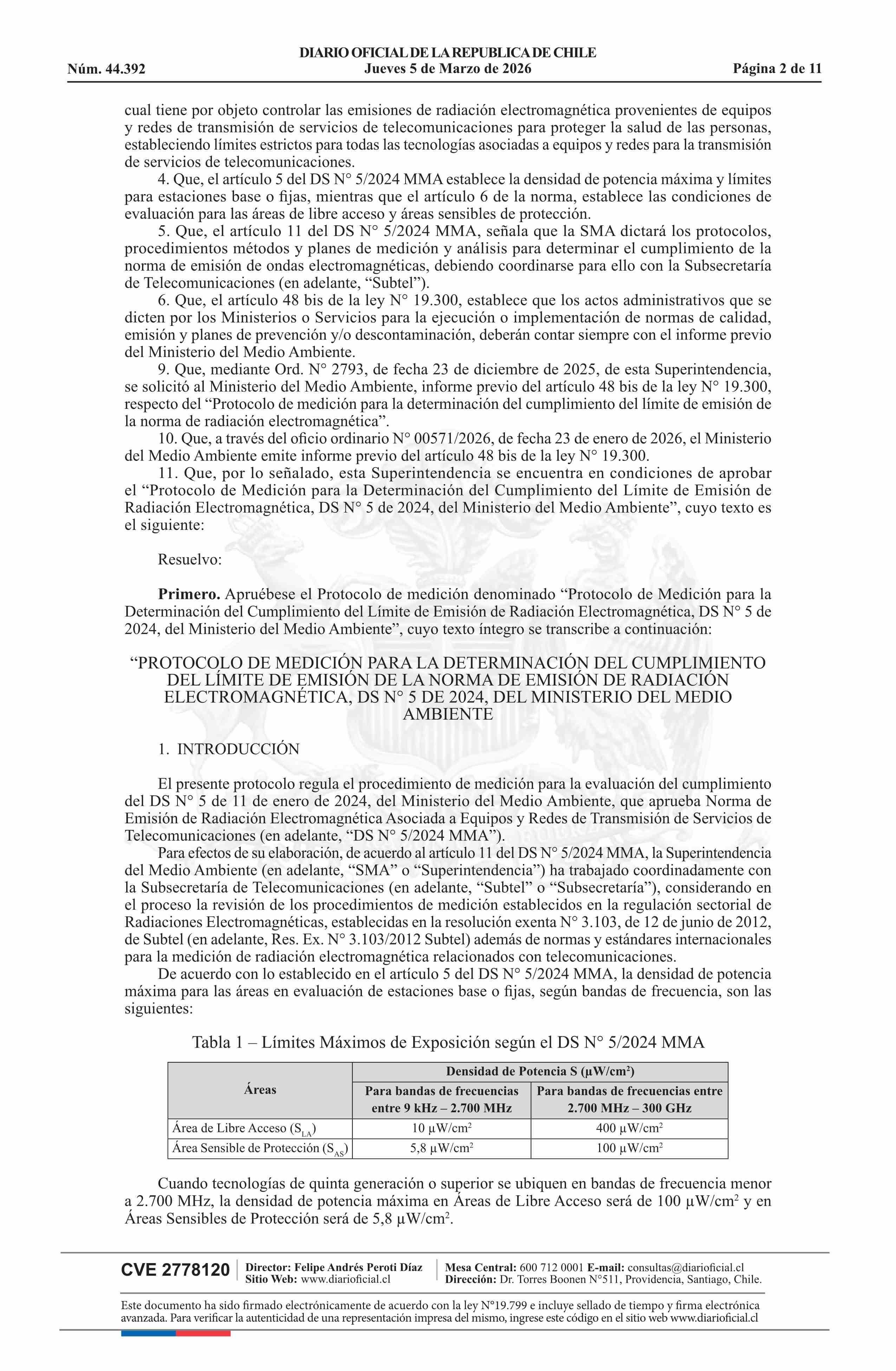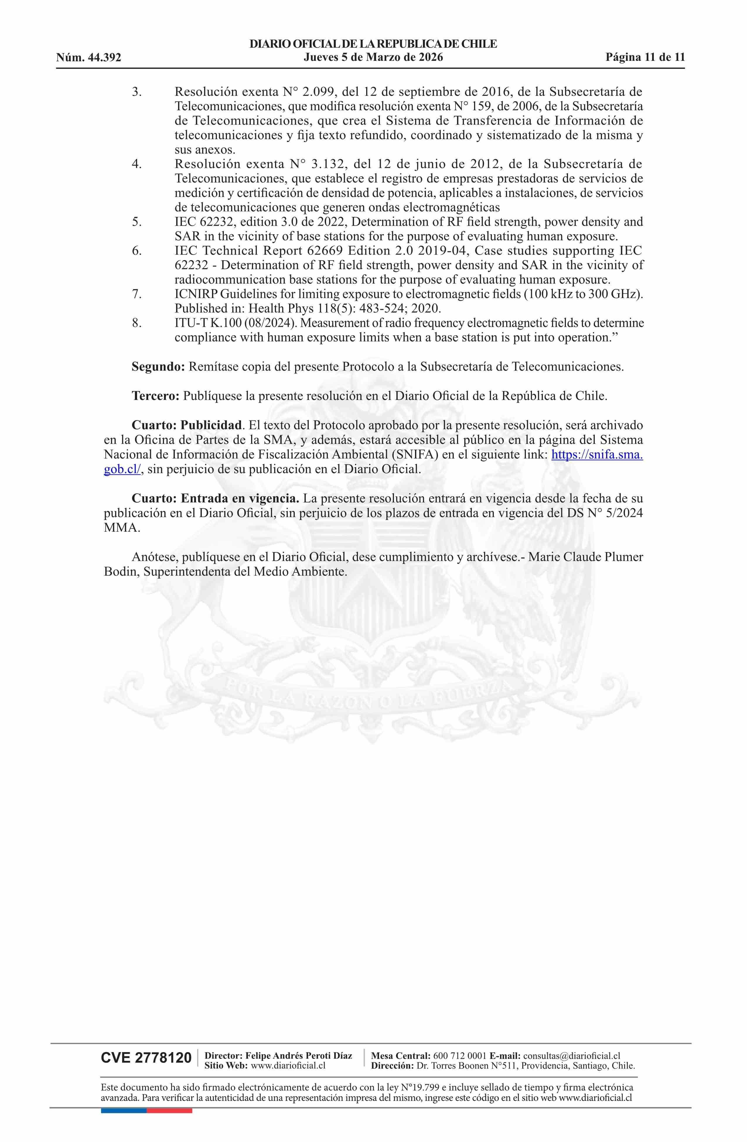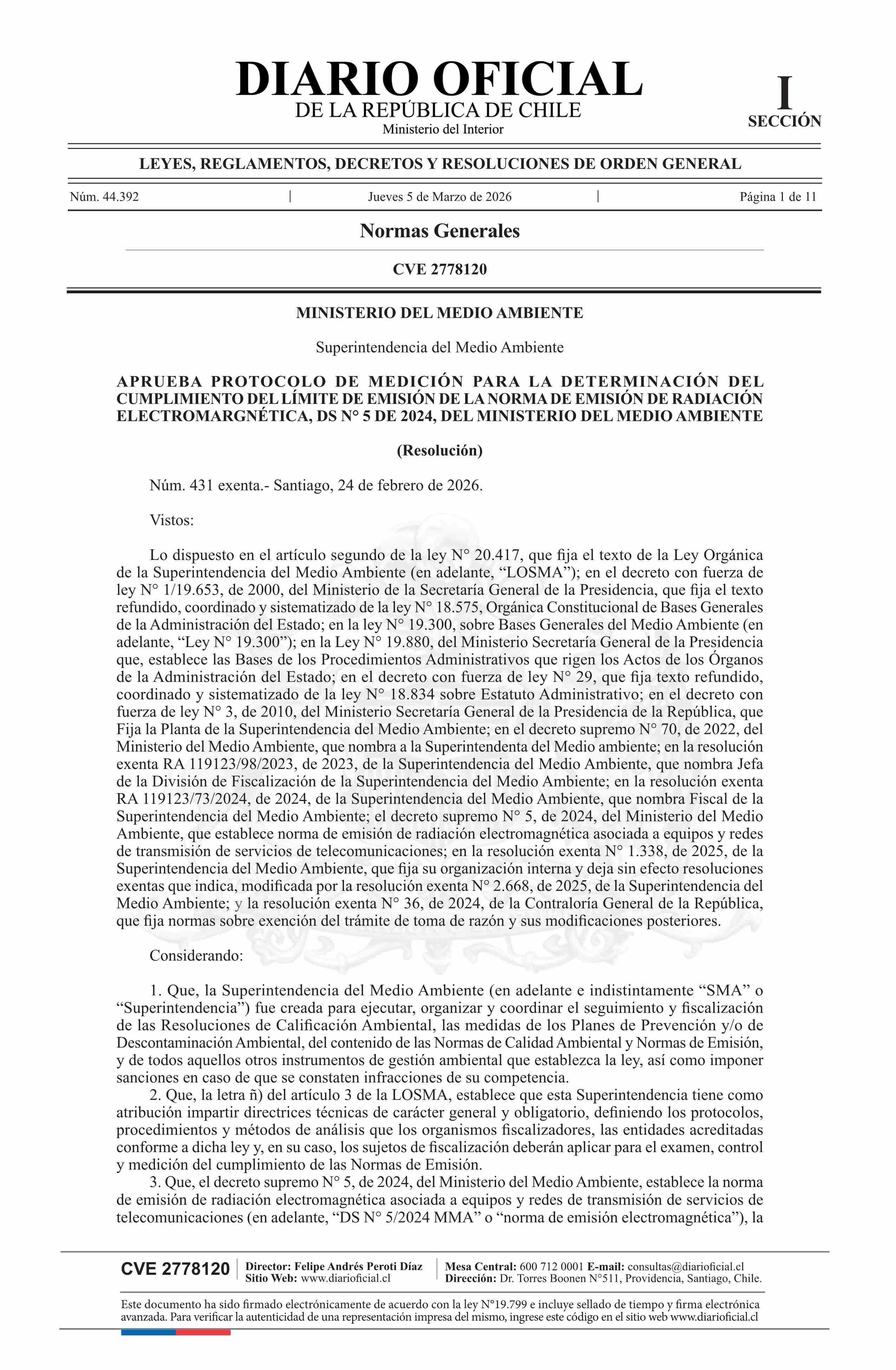 | Título: | Resolución exenta número 431, de 2026.- Aprueba Protocolo de medición para la determinación del cumplimiento del límite de emisión de la Norma de Emisión de Radiación Electromagnética, decreto N° 5 de 2024 |