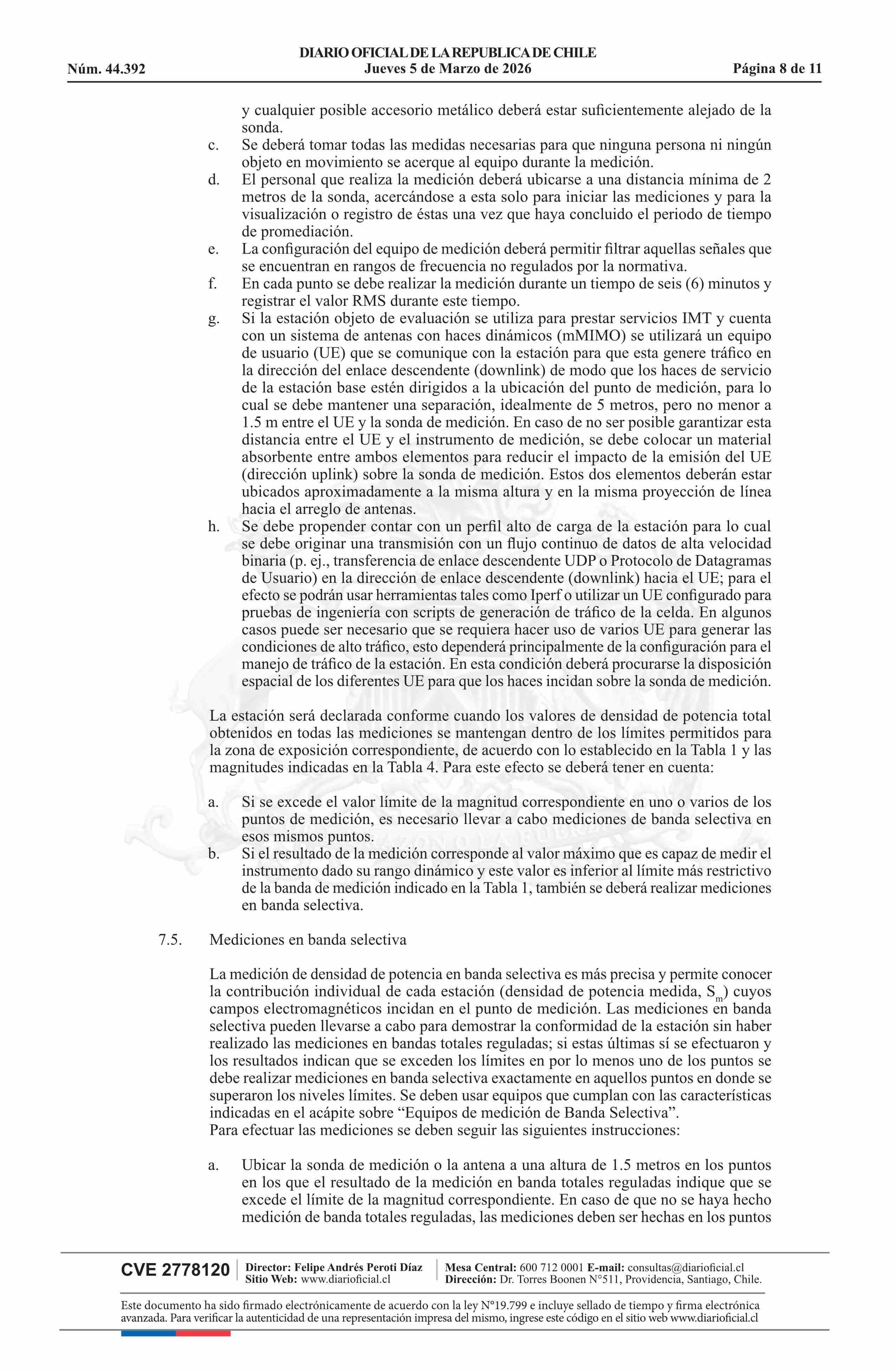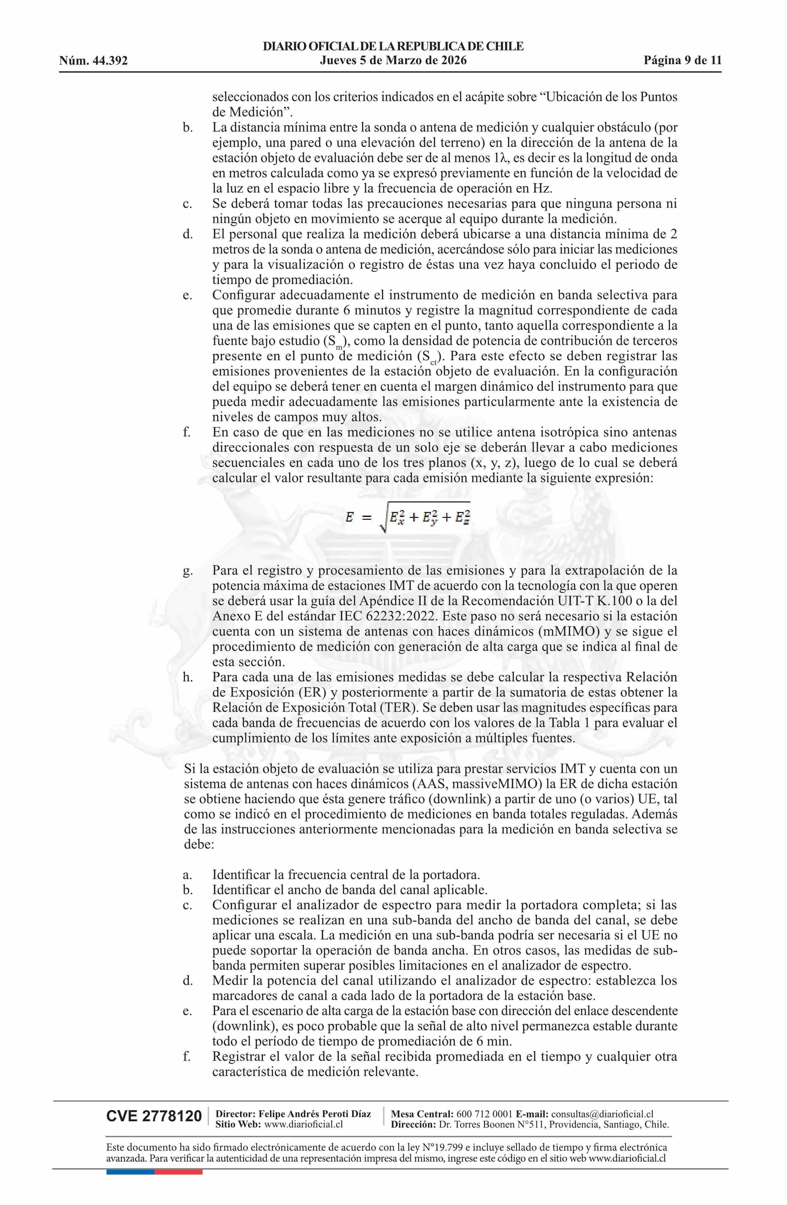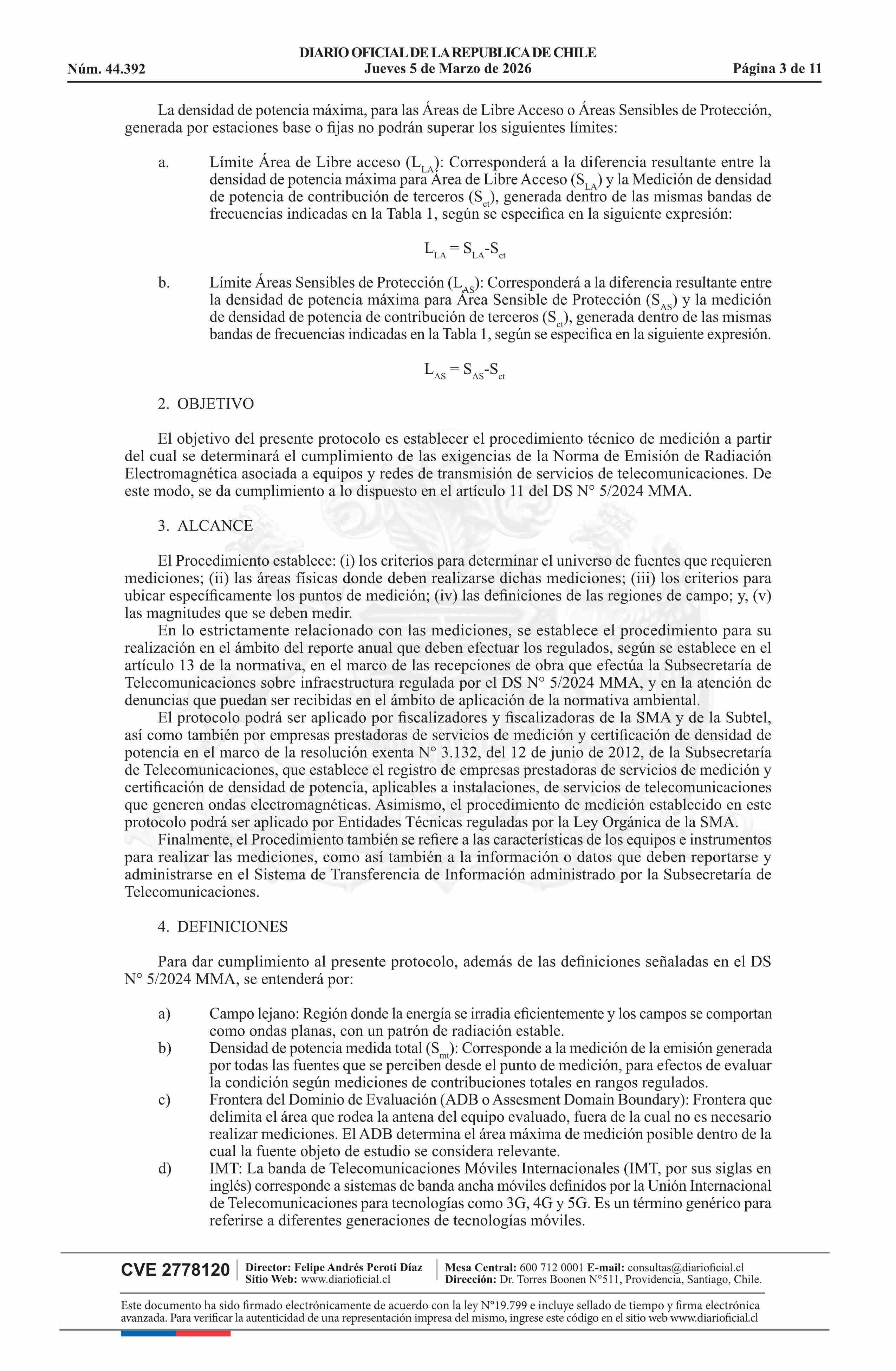 | Título: | Resolución exenta número 431, de 2026.- Aprueba Protocolo de medición para la determinación del cumplimiento del límite de emisión de la Norma de Emisión de Radiación Electromagnética, decreto N° 5 de 2024 |