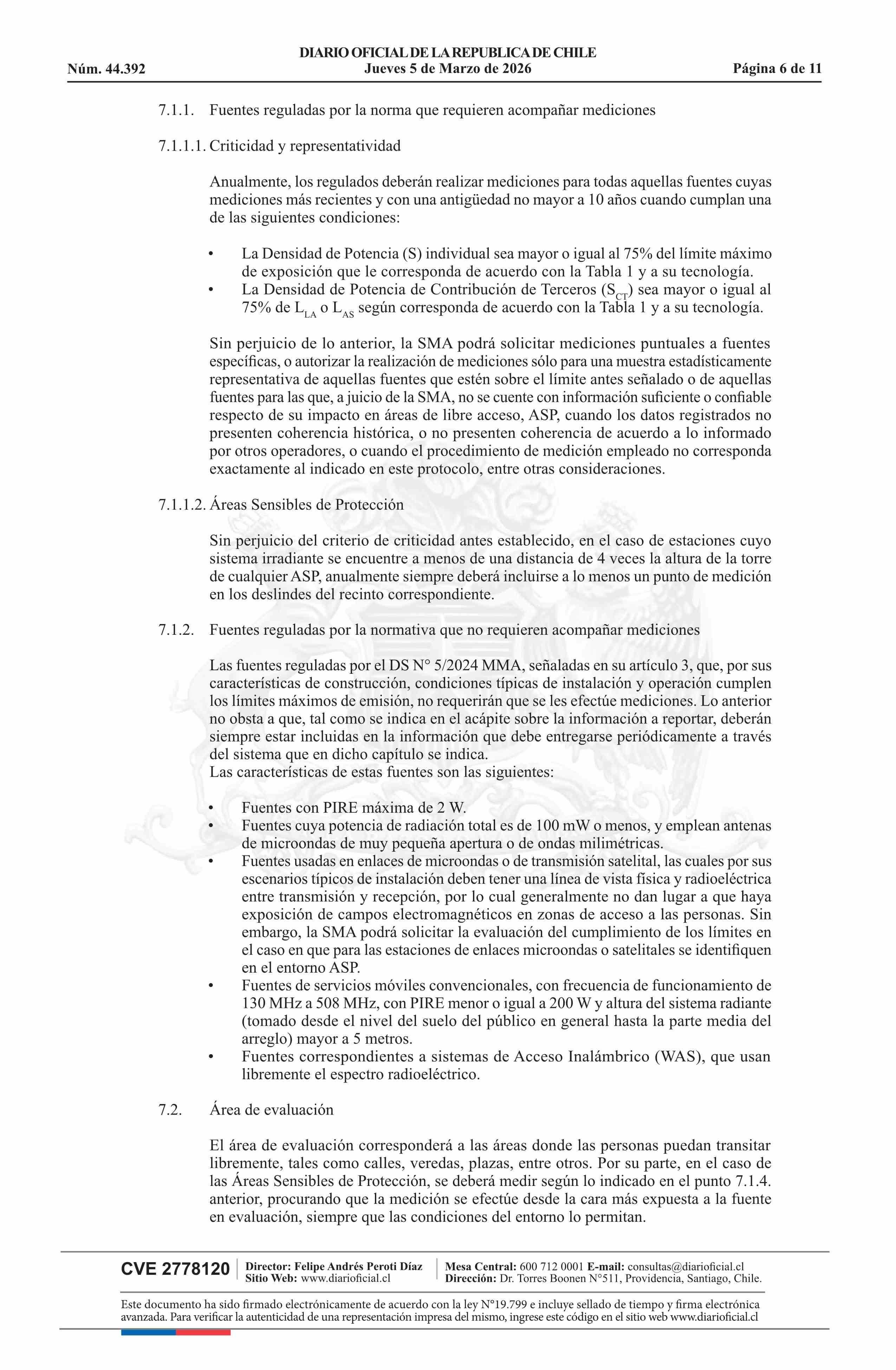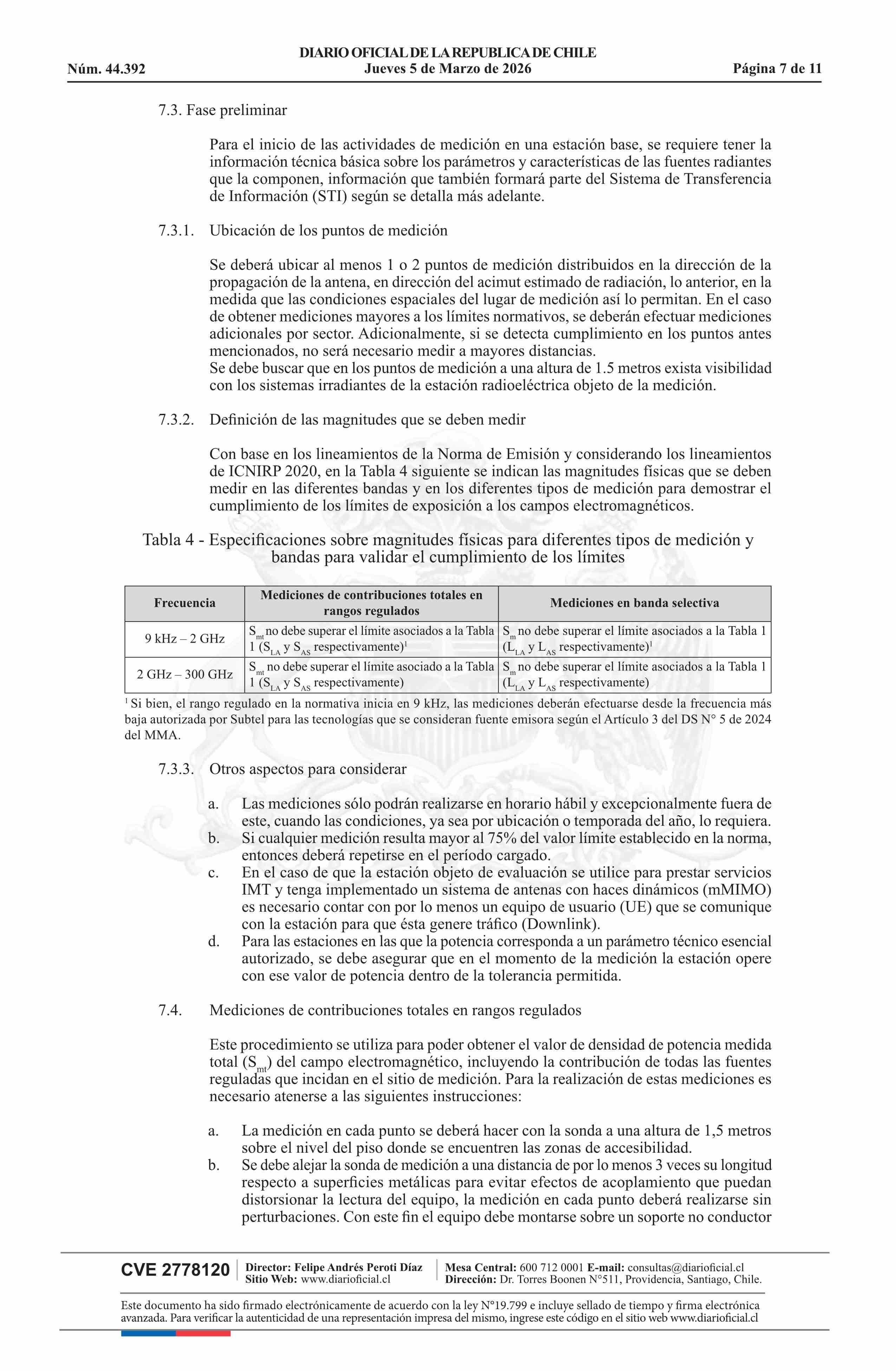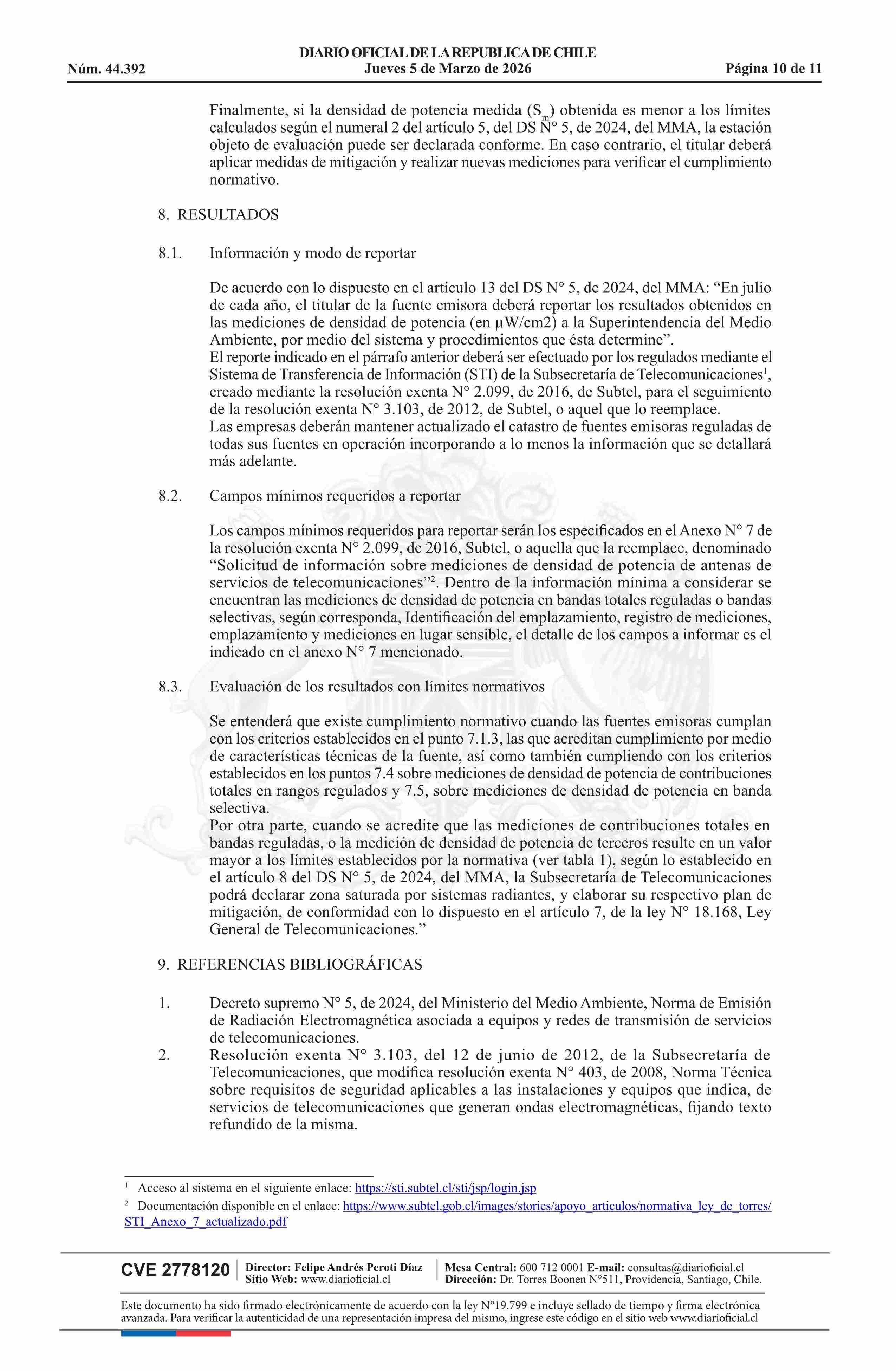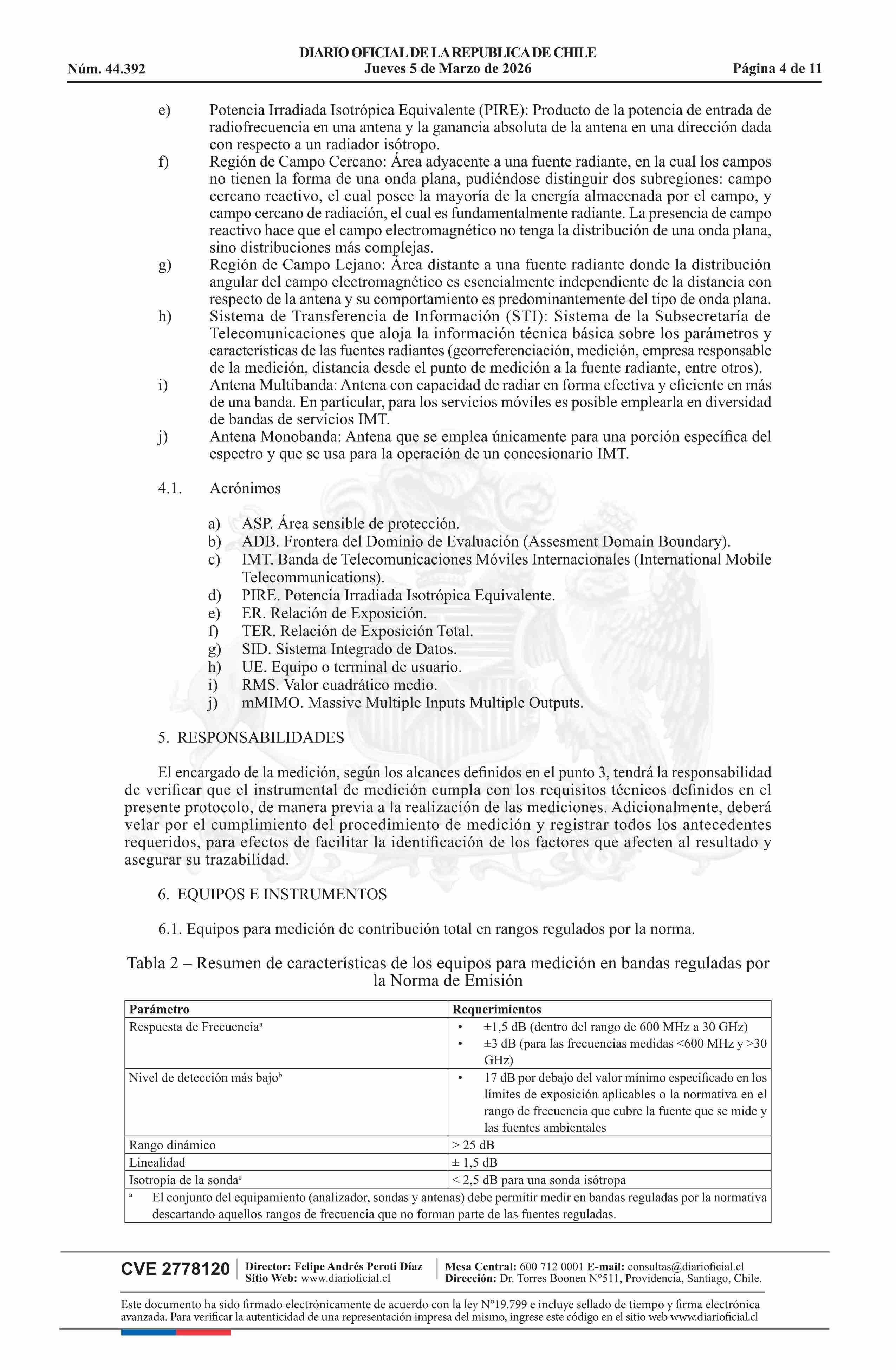 | Título: | Resolución exenta número 431, de 2026.- Aprueba Protocolo de medición para la determinación del cumplimiento del límite de emisión de la Norma de Emisión de Radiación Electromagnética, decreto N° 5 de 2024 |