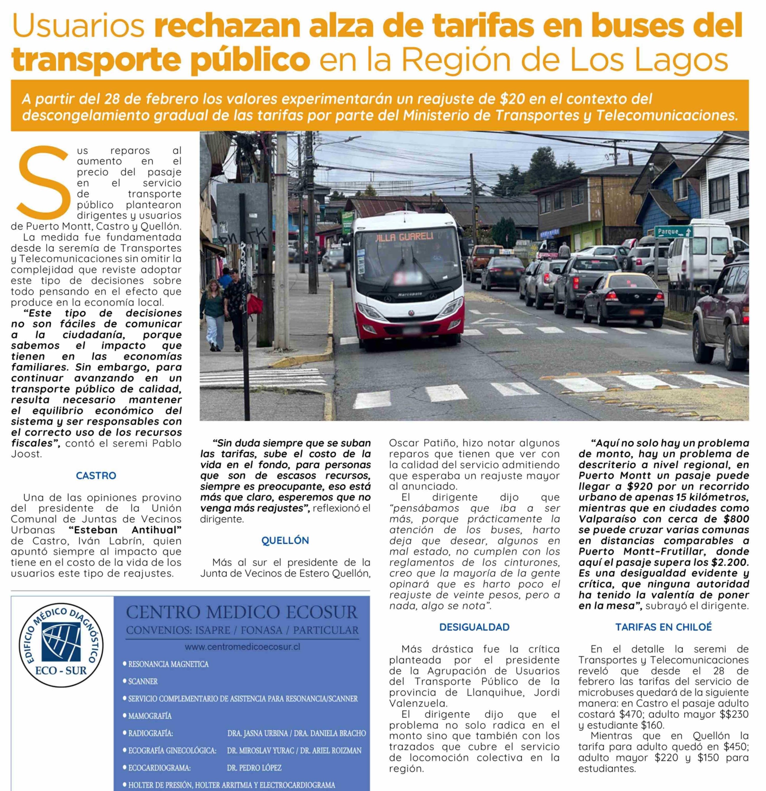 Usuarios rechazan alza de tarifas en buses del transporte público en la Región de Los Lagos