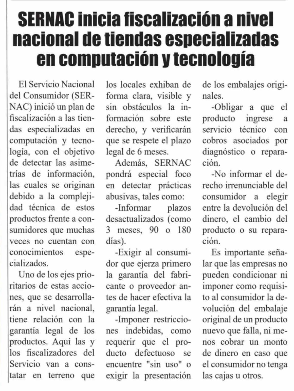 SERNAC inicia fiscalización a nivel nacional de tiendas especializadas en computación y tecnología