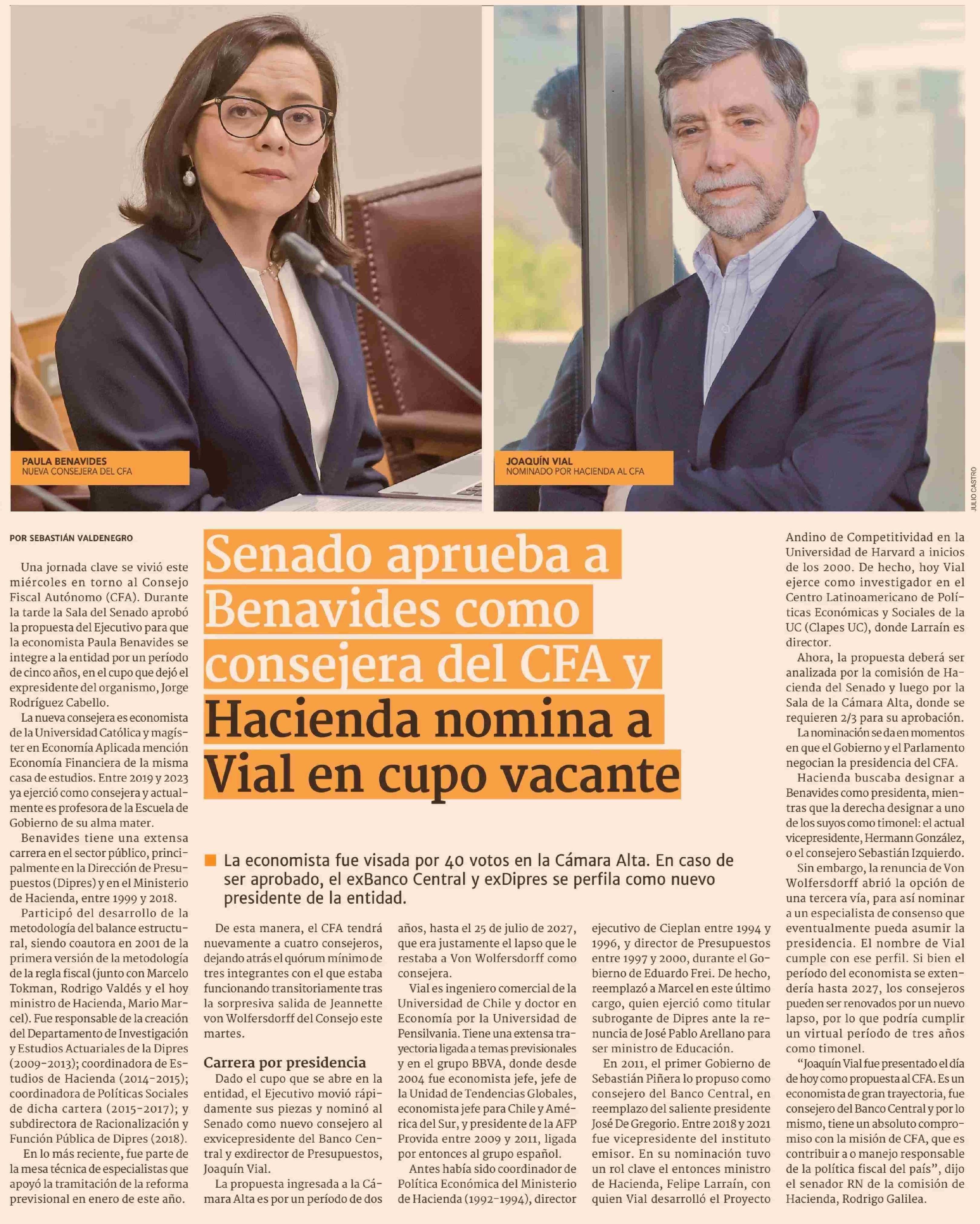 Senado aprueba a Benavides como consejera del CFA y Hacienda nomina a Vial en cupo vacante