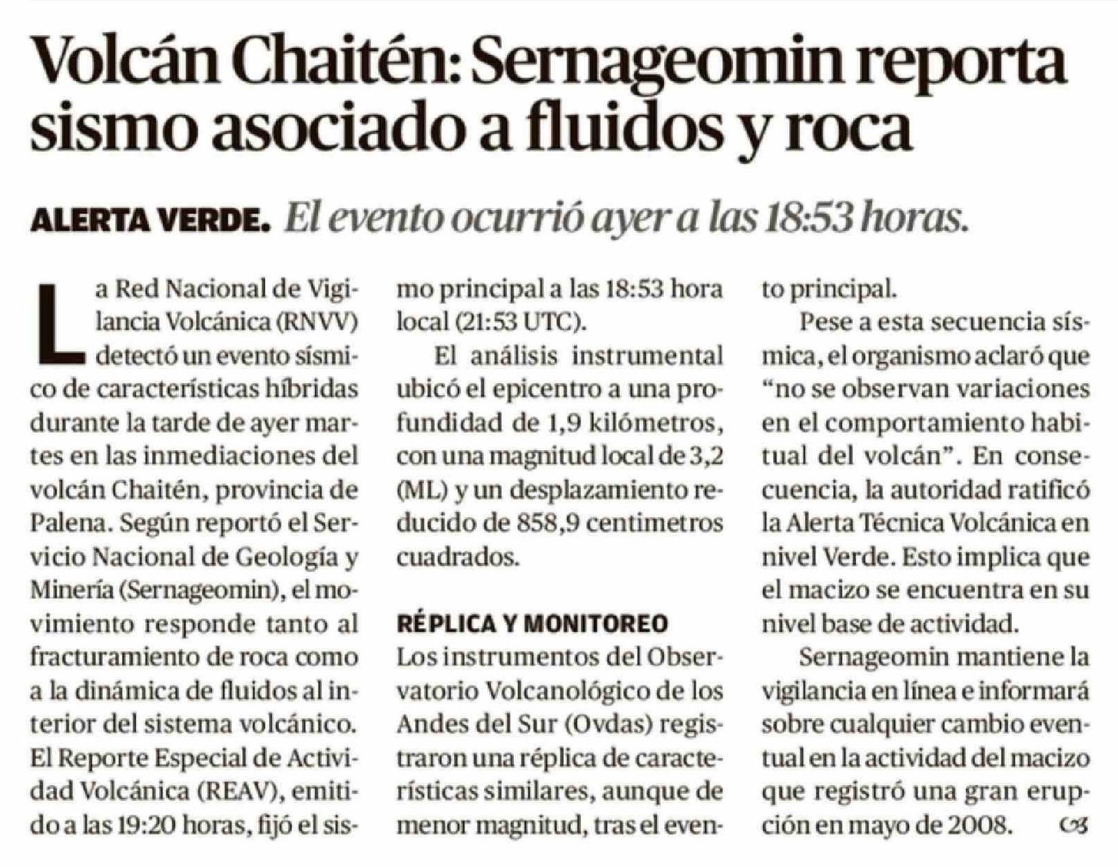 Volcán Chaitén: Sernageomin reporta sismo asociado a fluidos y roca