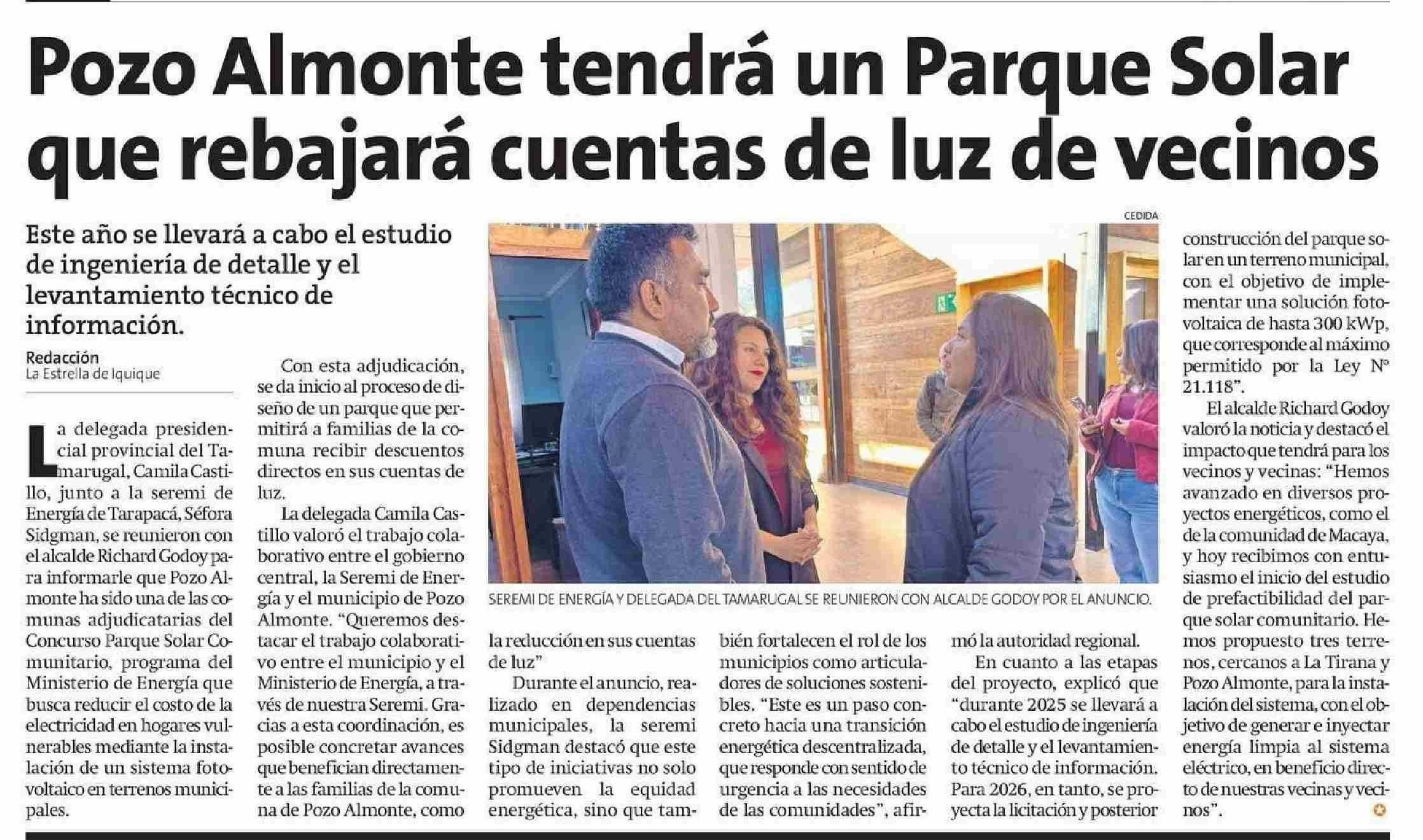 Pozo Almonte tendrá un Parque Solar que rebajará cuentas de luz de vecinos