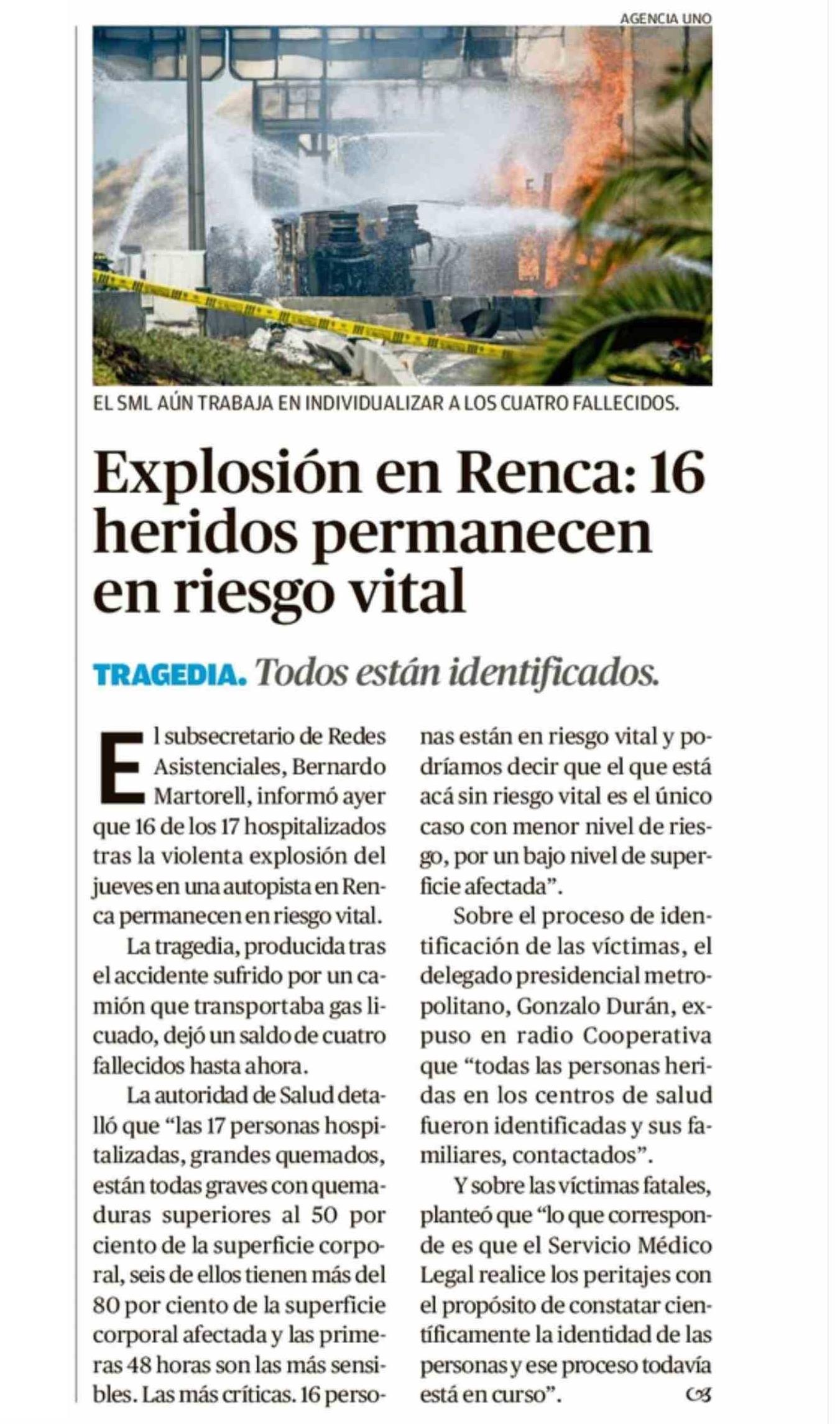 Explosión en Renca: 16 heridos permanecen en riesgo vital