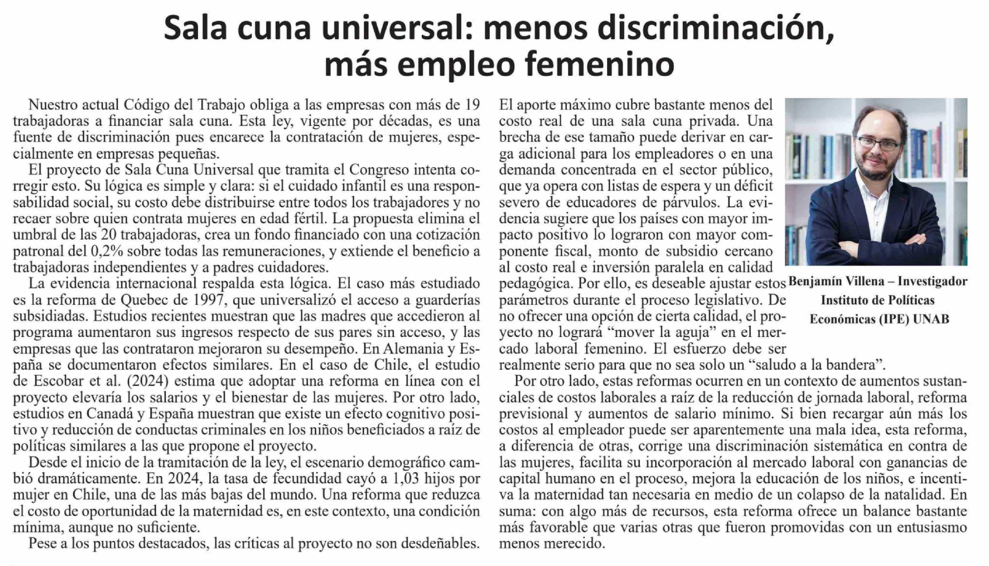 Columnas de Opinión: Sala cuna universal: menos discriminación, más empleo femenino