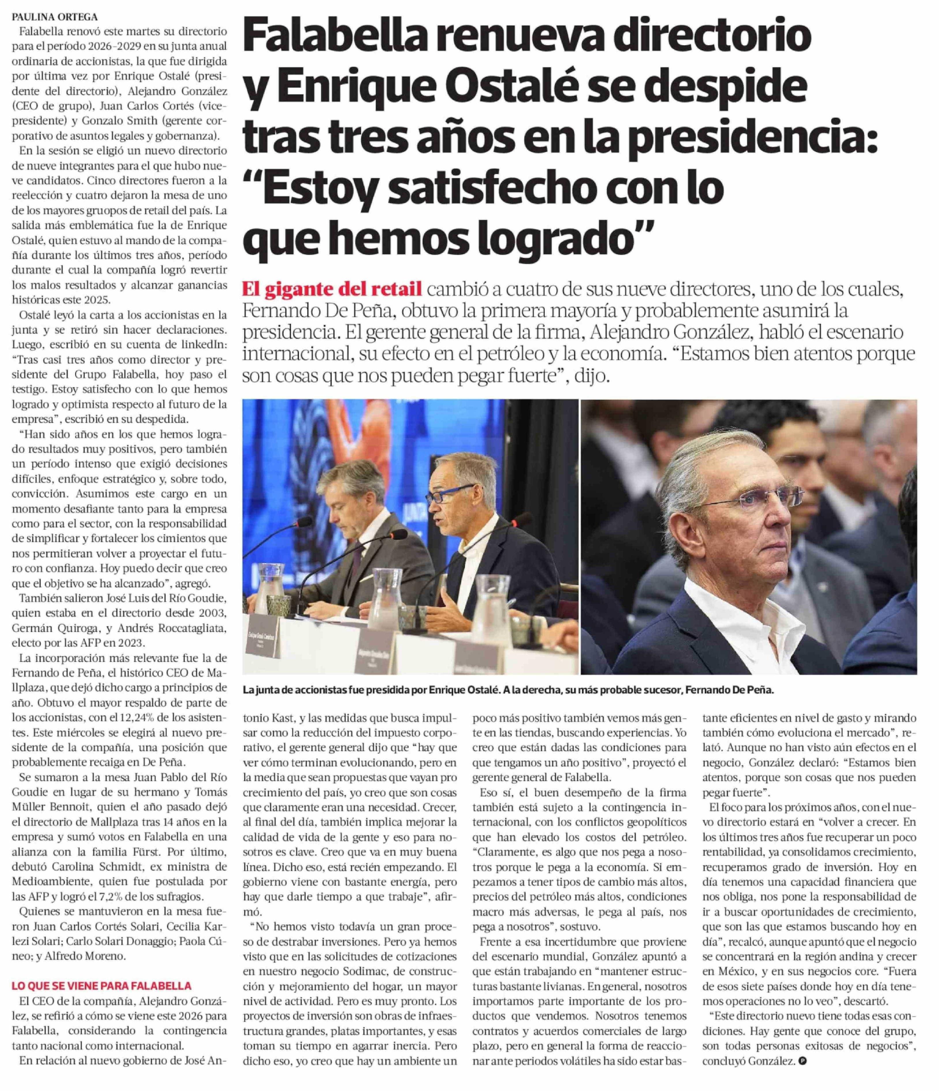 Falabella renueva directorio y Enrique Ostalé se despide tras tres años en la presidencia: "Estoy satisfecho con lo que hemos logrado"