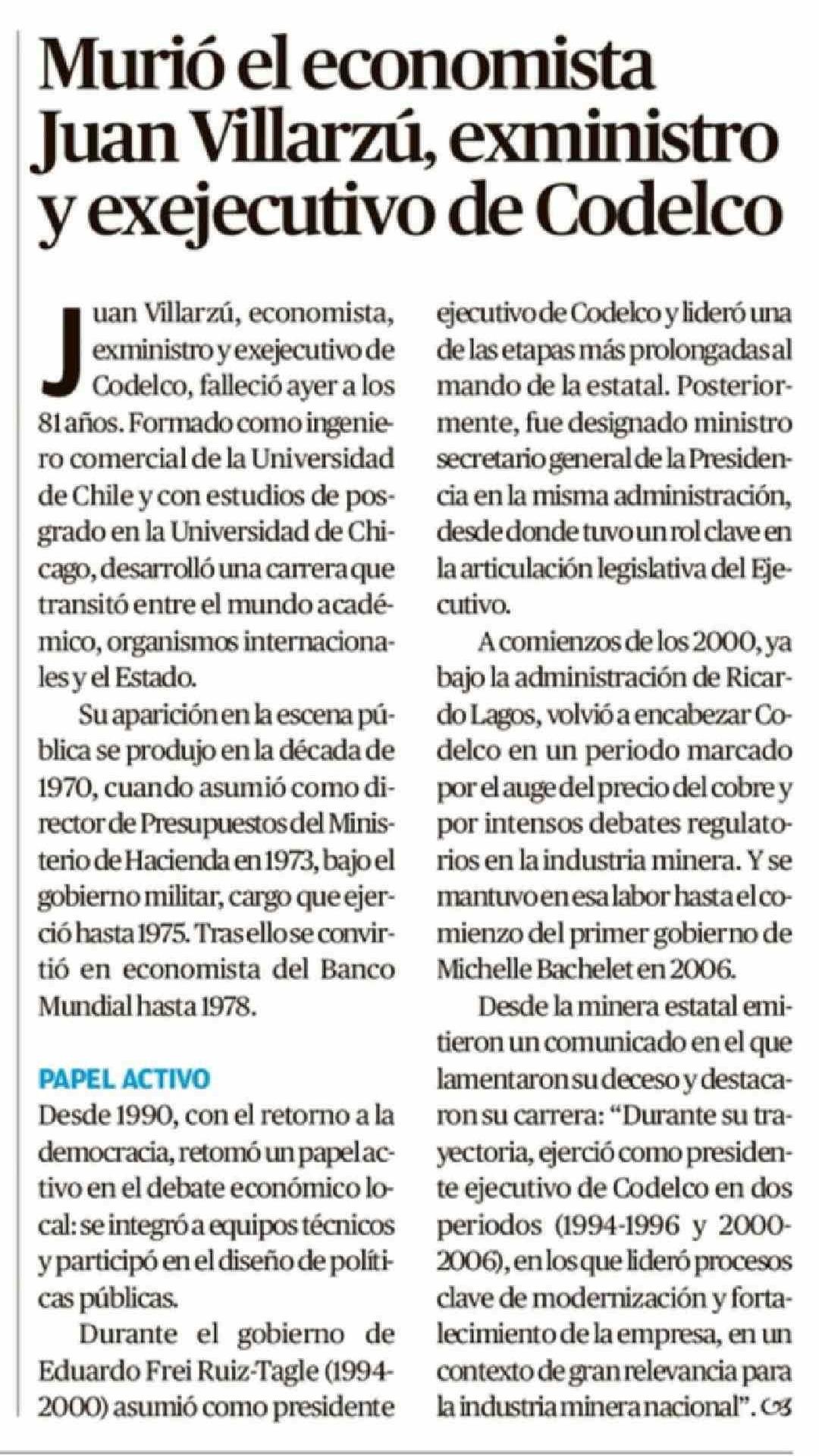 Murió el economista Juan Villarzú, exministro y exejecutivo de Codelco