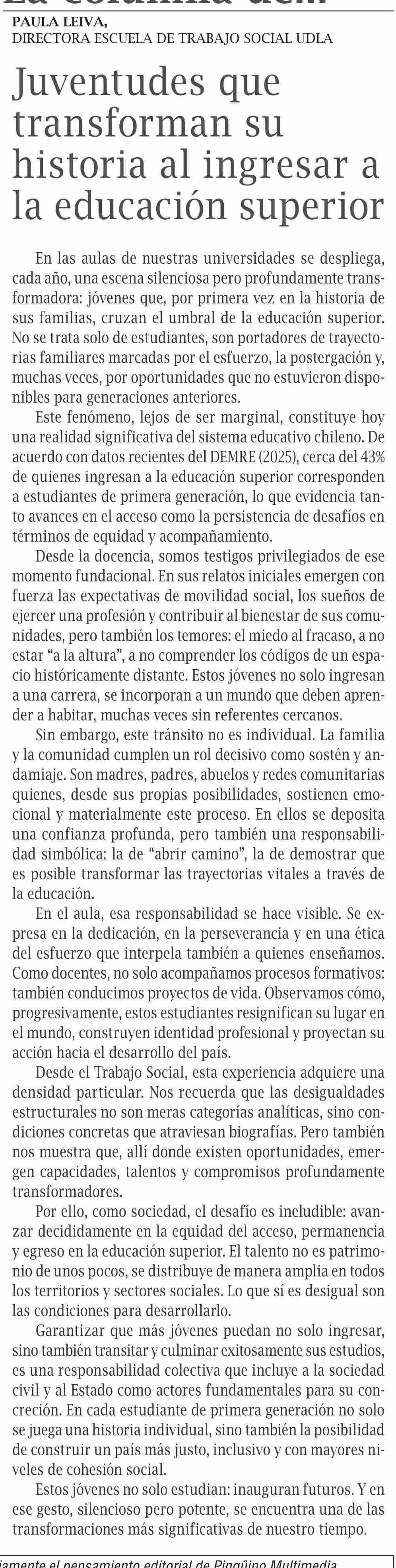 Título: Columnas de Opinión: Juventudes que transforman su historia al ingresar a la educación superior