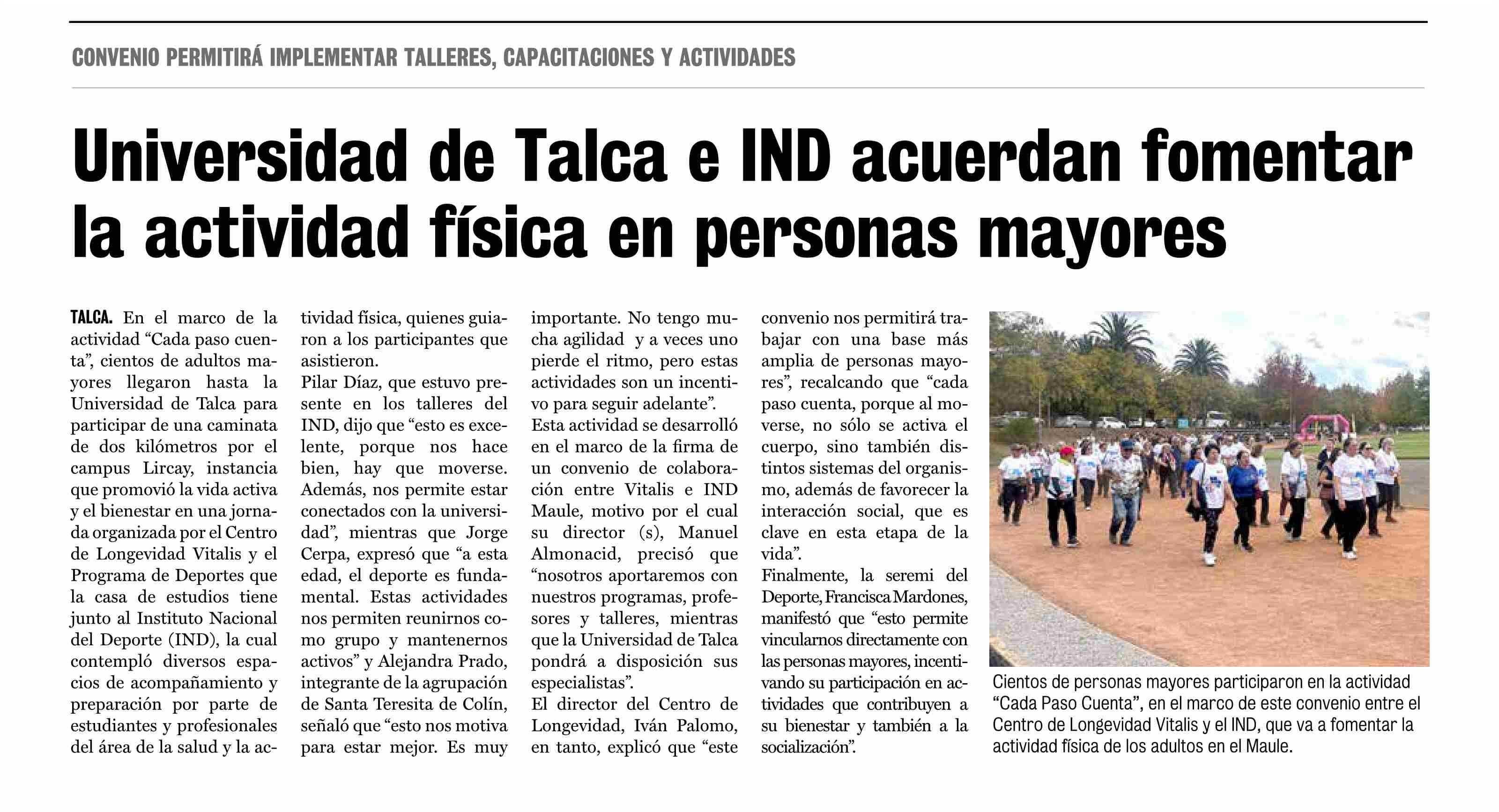 Universidad de Talca e IND acuerdan fomentar la actividad física en personas mayores