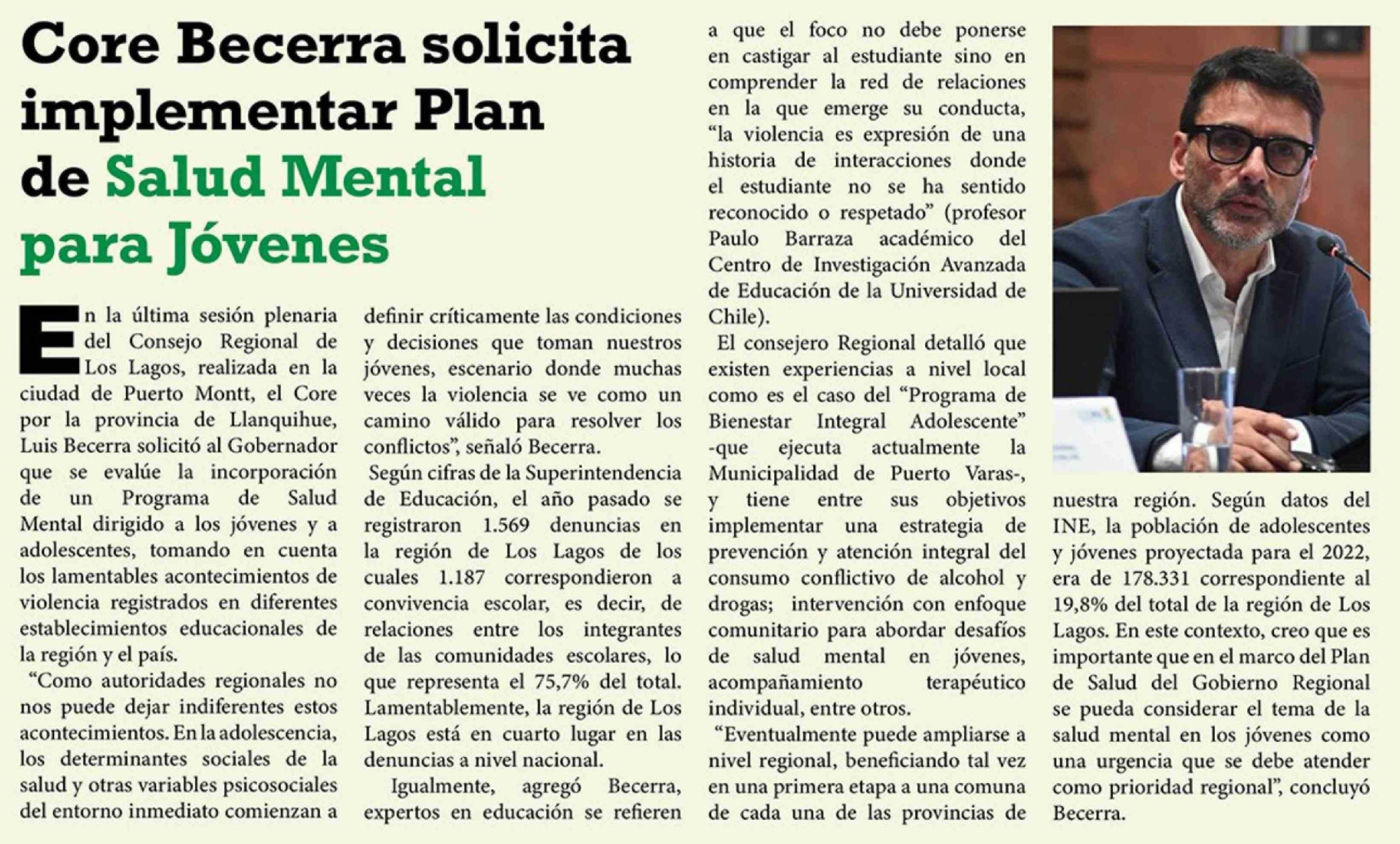 Título: Core Becerra solicita implementar Plan de Salud Mental para Jóvenes