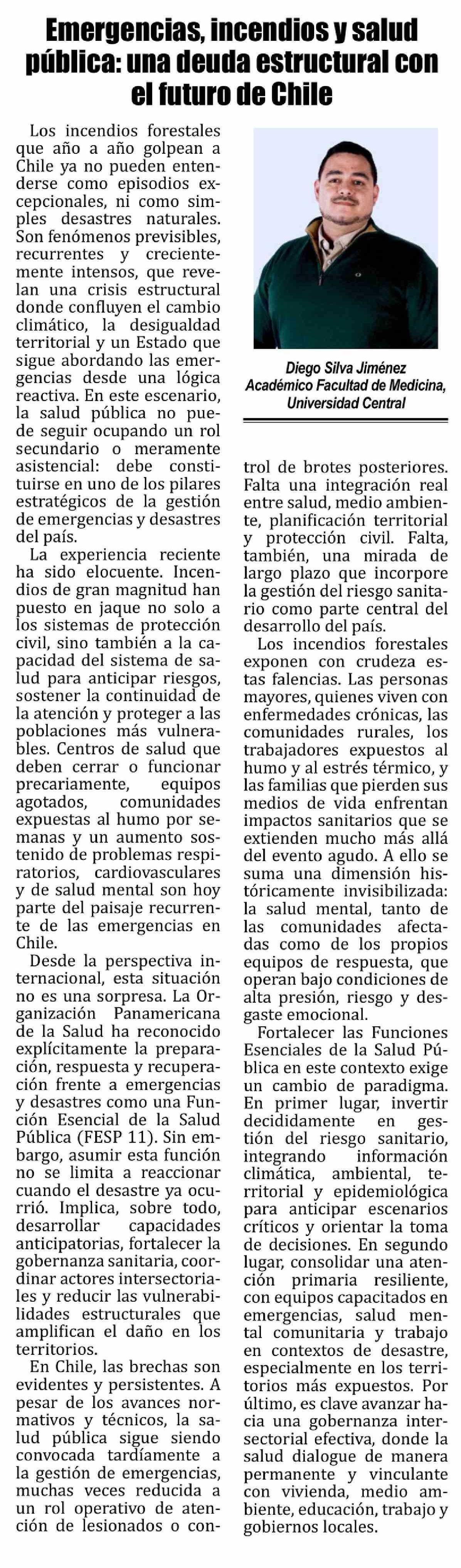 Título: Columnas de Opinión: Emergencias, incendios y salud pública: una deuda estructural con el futuro de Chile