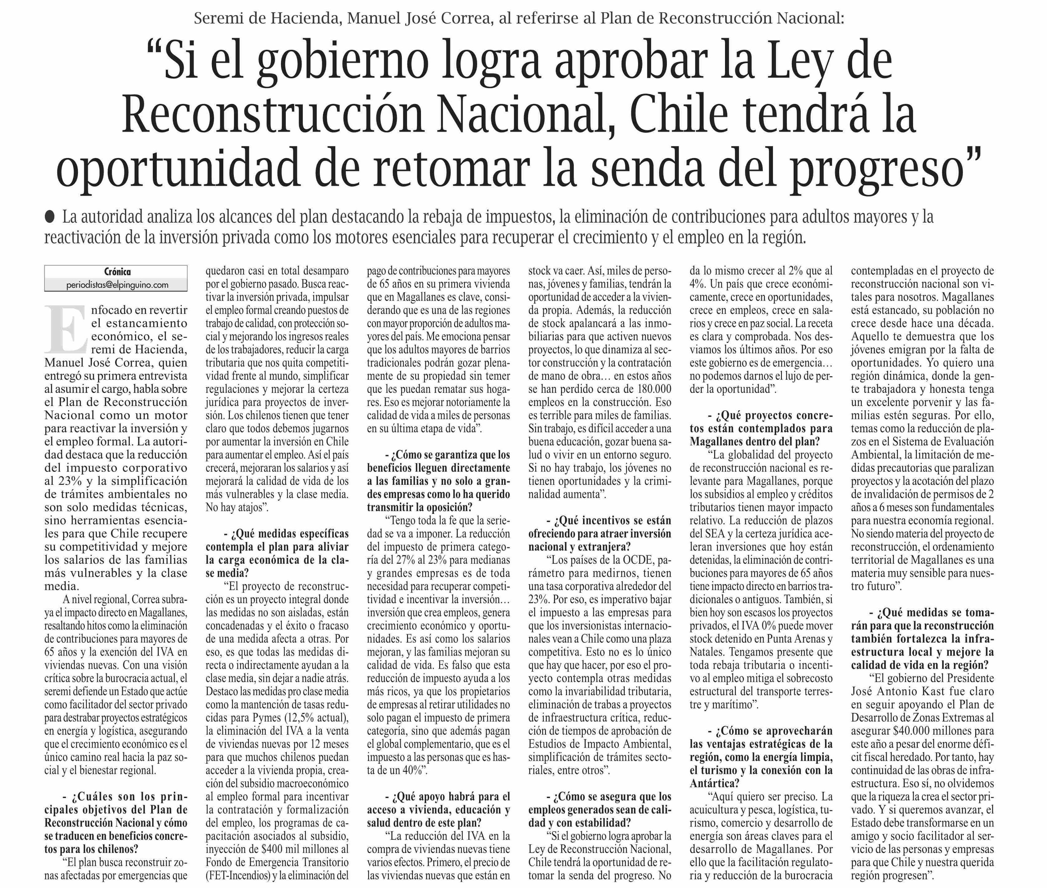 “Si el gobierno logra aprobar la Ley de Reconstrucción Nacional, Chile tendrá la oportunidad de retomar la senda del progreso”