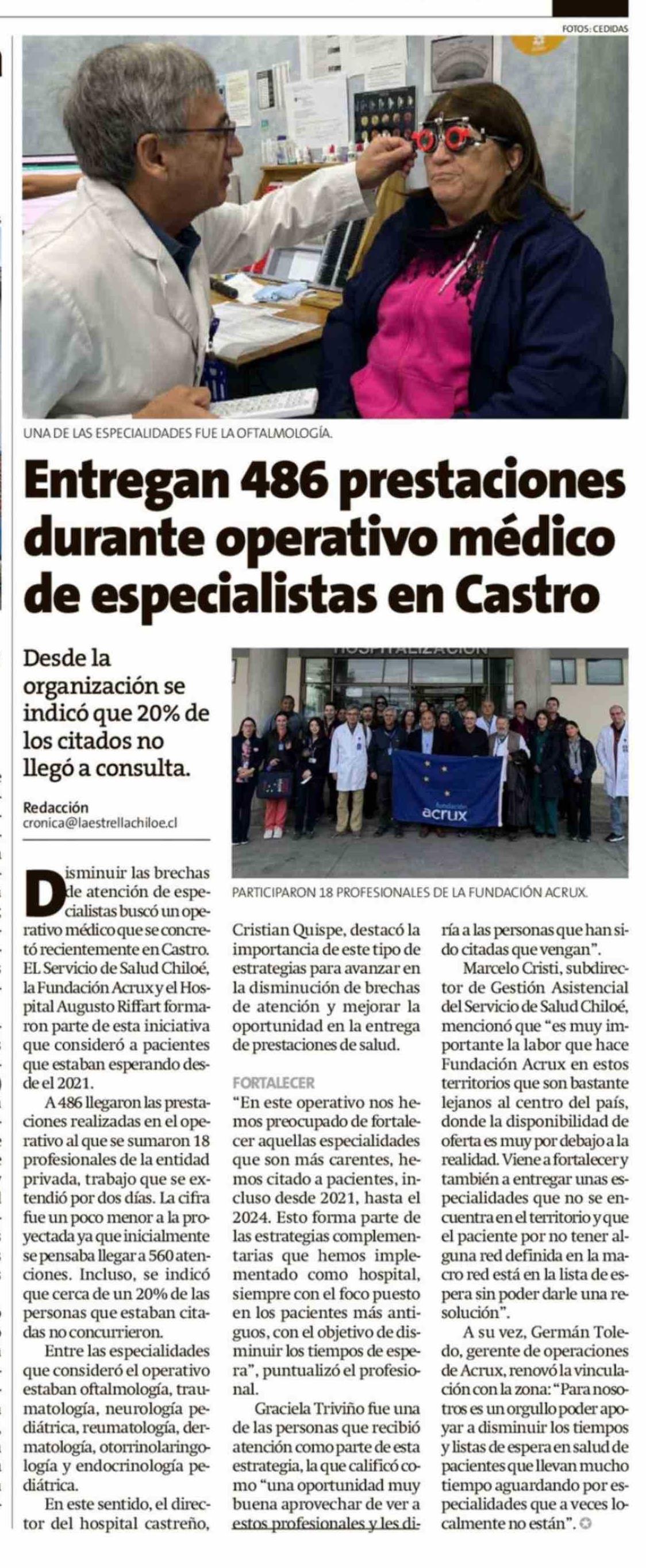 Entregan 486 prestaciones durante operativo médico de especialistas en Castro