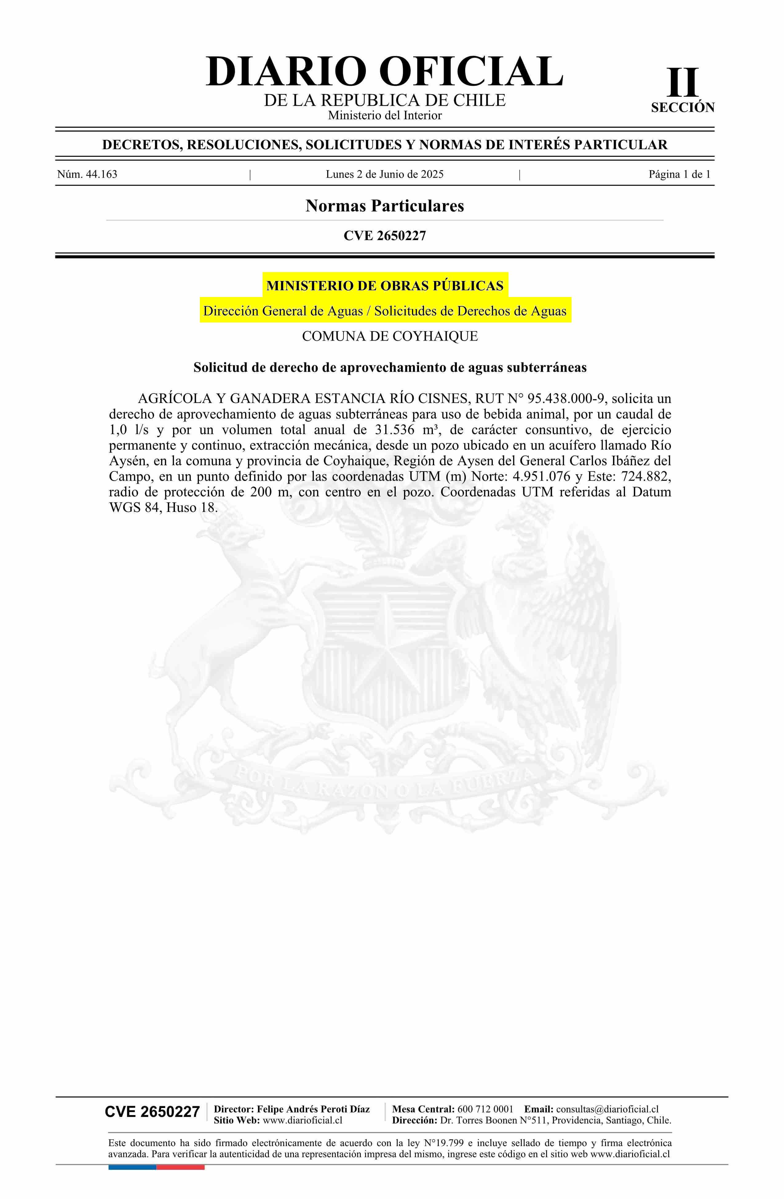 Solicitud Agrícola y Ganadera Estancia Río Cisnes