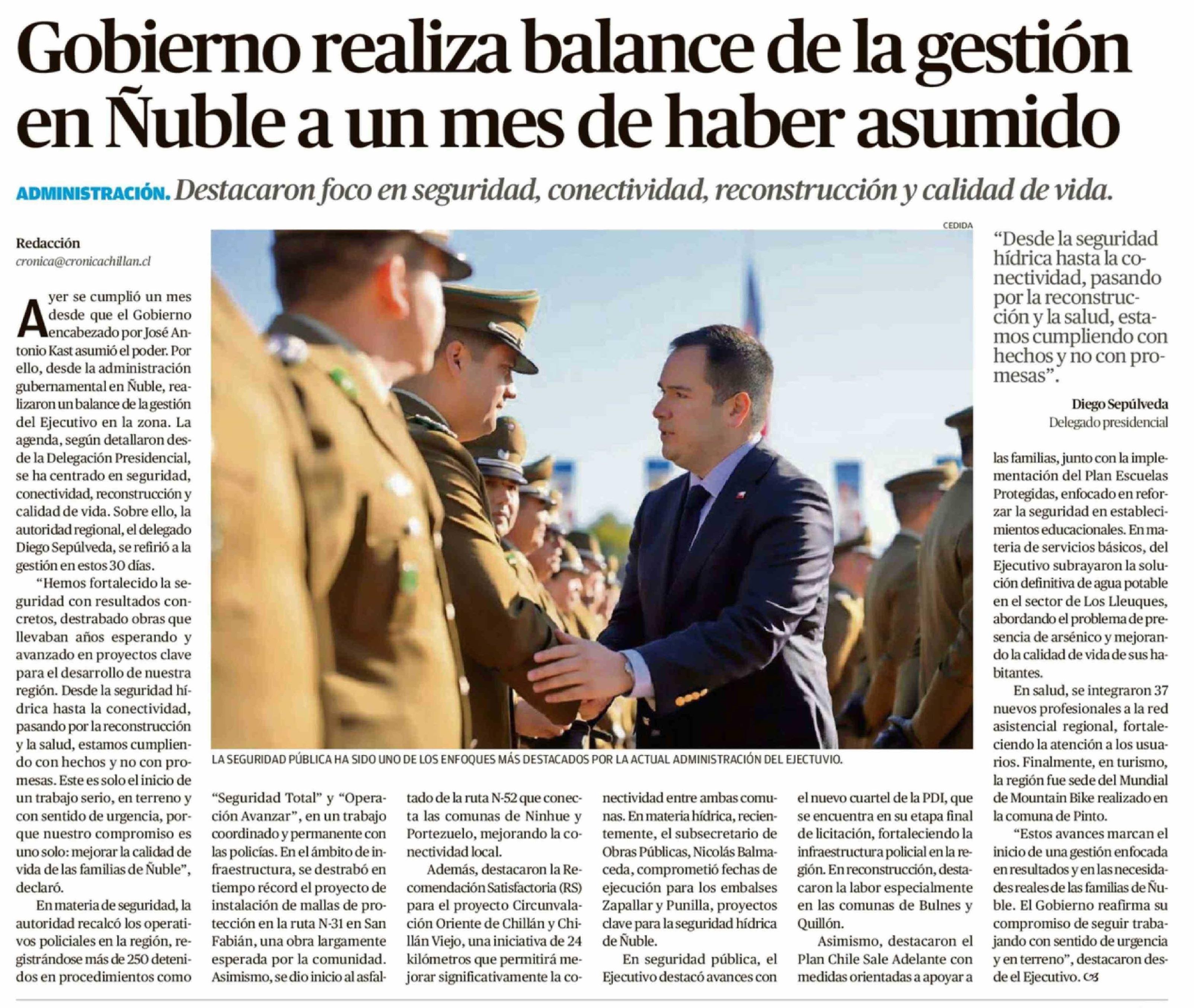 Gobierno realiza balance de la gestión en Ñuble a un mes de haber asumido