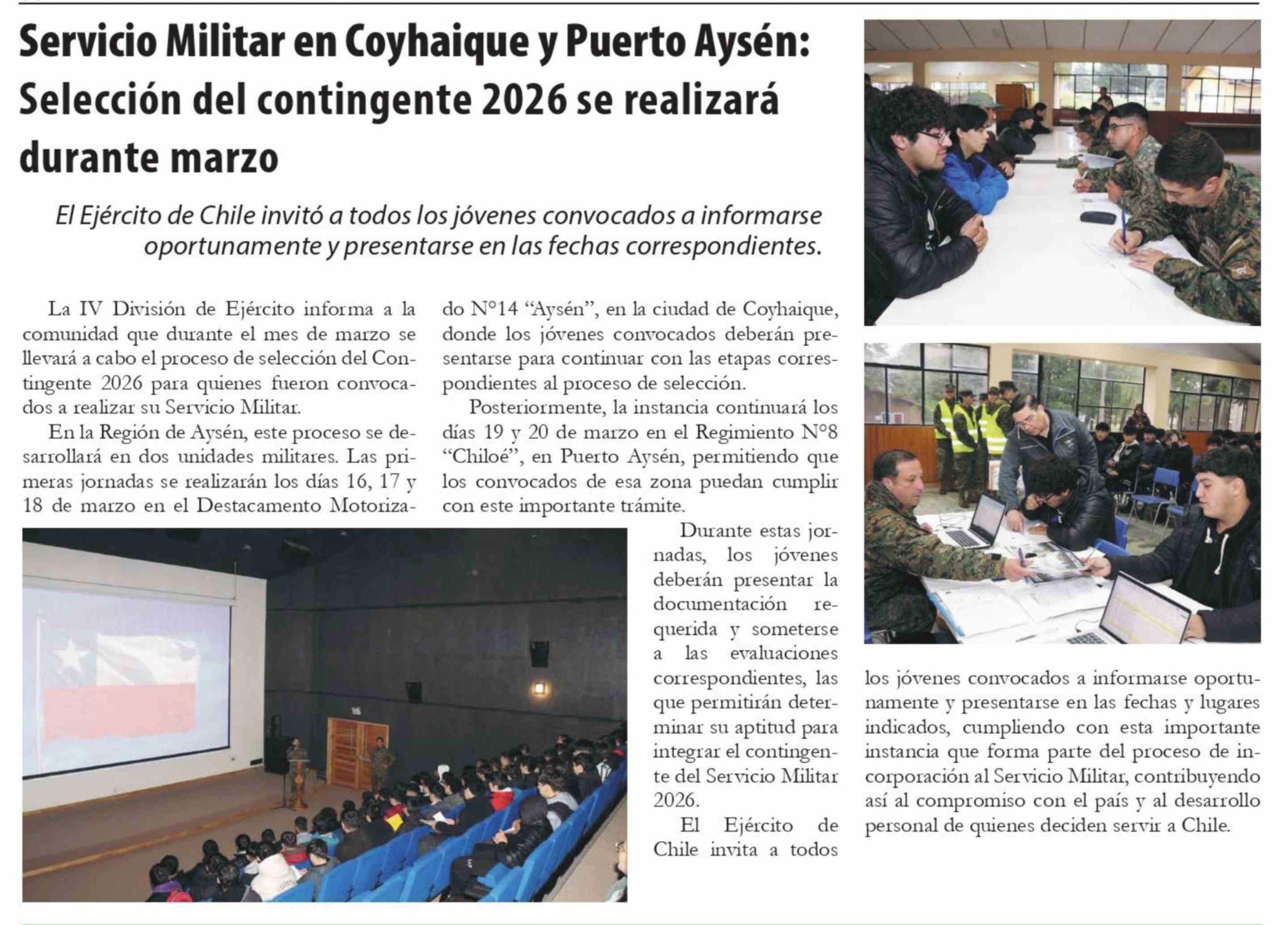 Servicio Militar en Coyhaique y Puerto Aysén: Selección del contingente 2026 se realizará durante marzo