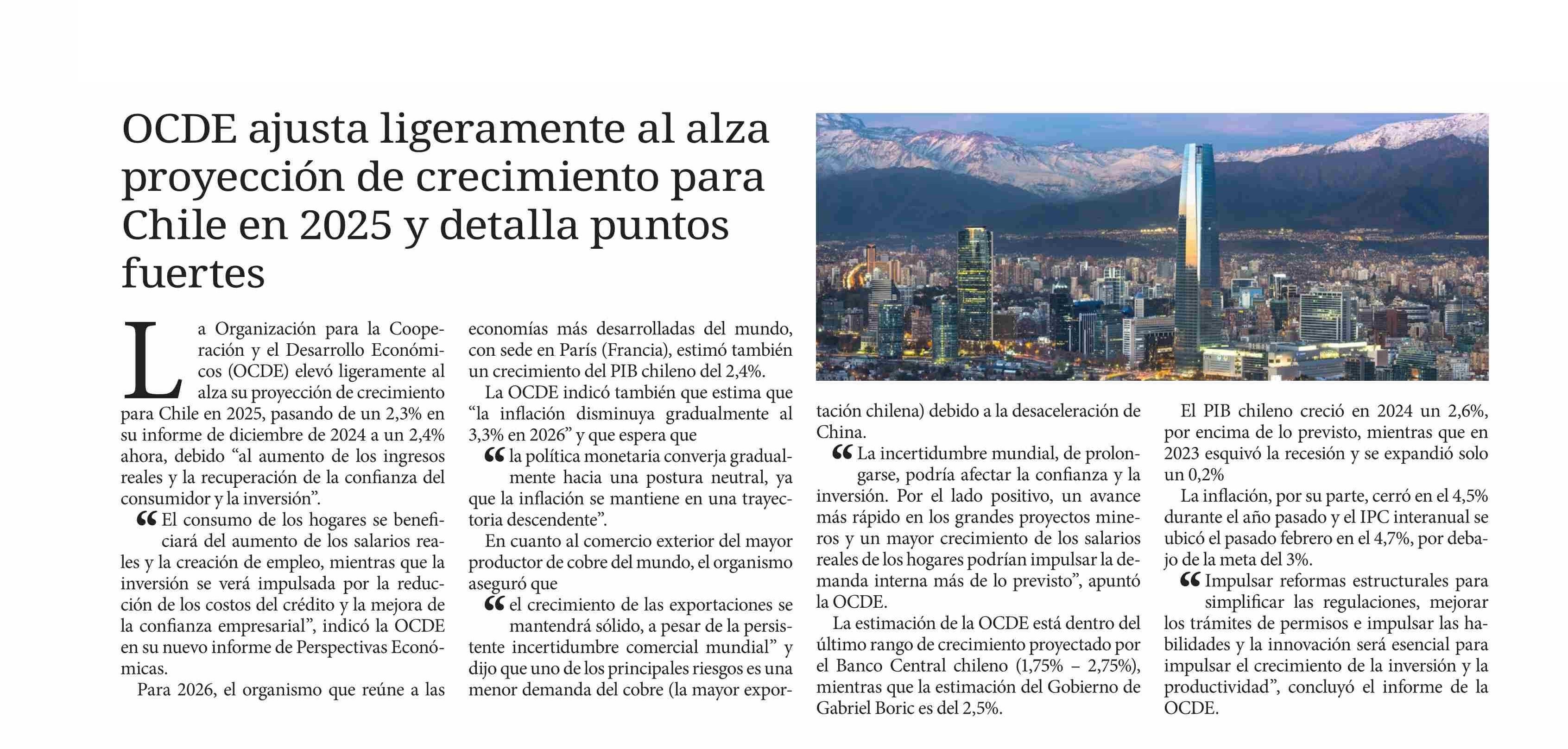 OCDE ajusta ligeramente al alza proyección de crecimiento para Chile en 2025 y detalla puntos fuertes