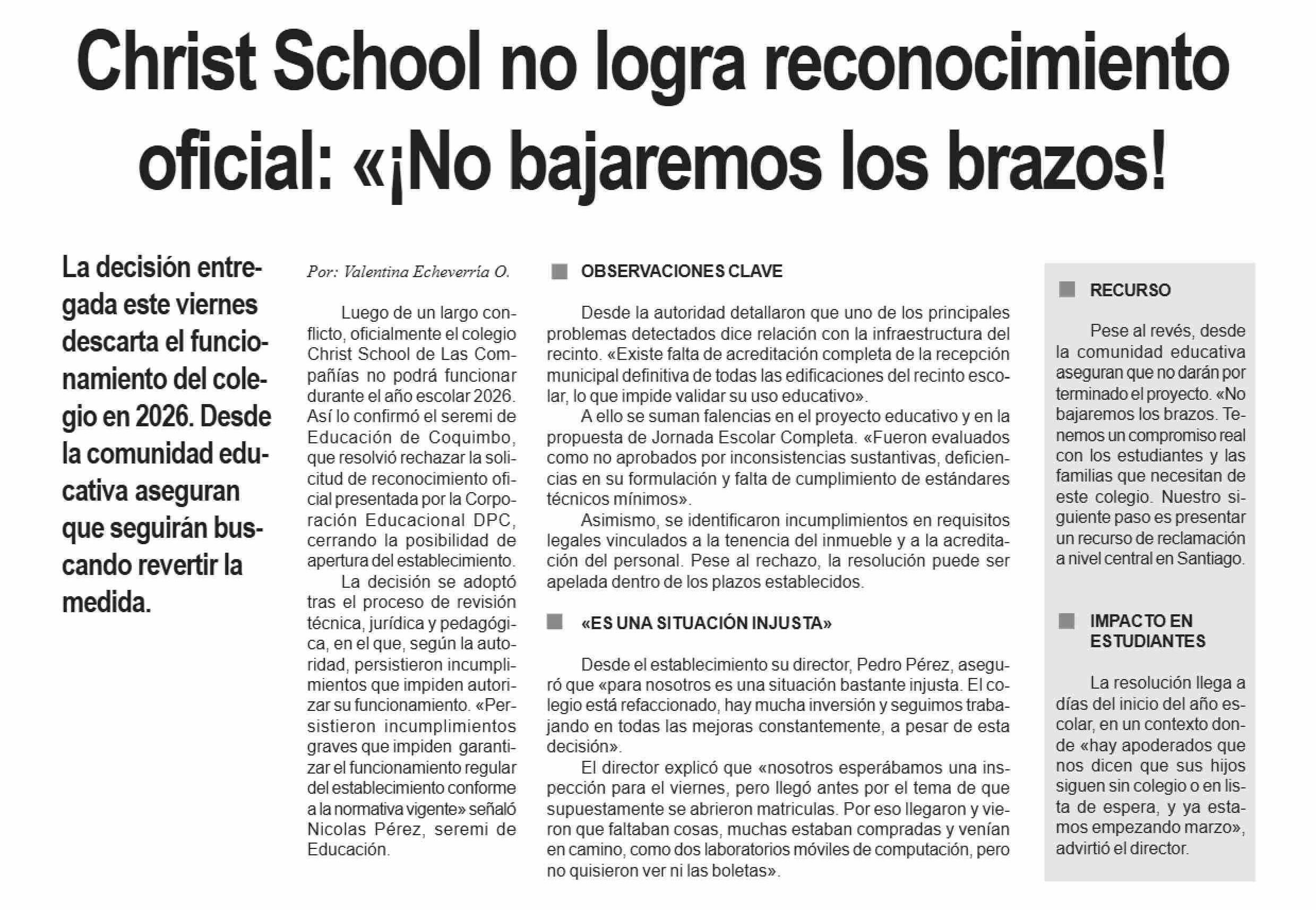 Christ School no logra reconocimiento oficial: «¡No bajaremos los brazos!