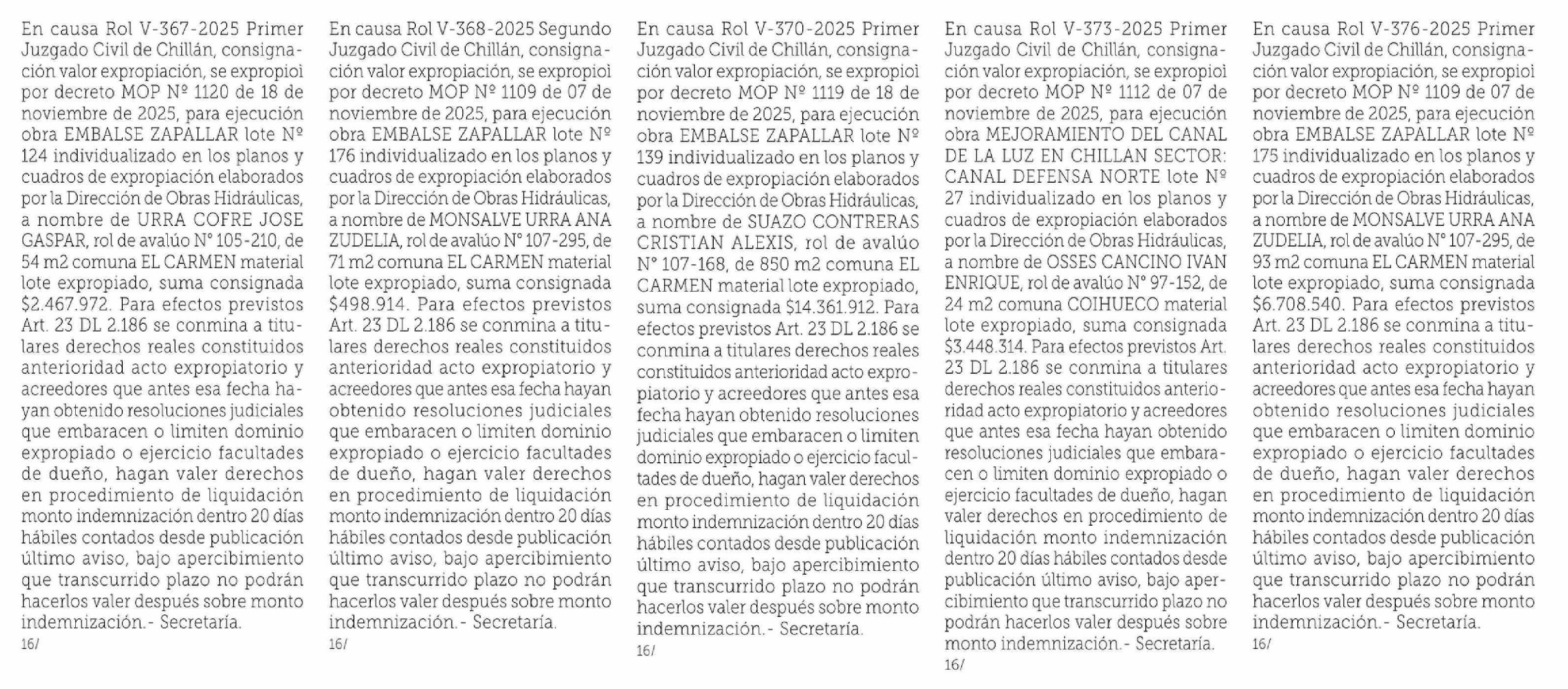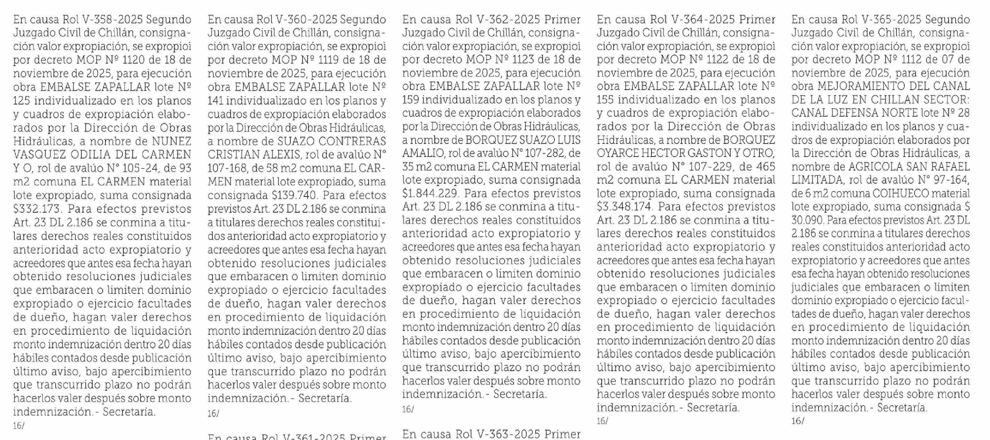 | Título: | En causa Rol V-358-2025 Segundo Juzgado Civil de Chillán, consignación valor expropiación, se expropioì por decreto MOP Nº 1120 de 18 de noviembre de 2025, para ejecución obra EMBALSE ZAPALLAR lote Nº 125 individualizado en los planos y cuadros de expropiación elaborados por la Dirección de Obras Hi |