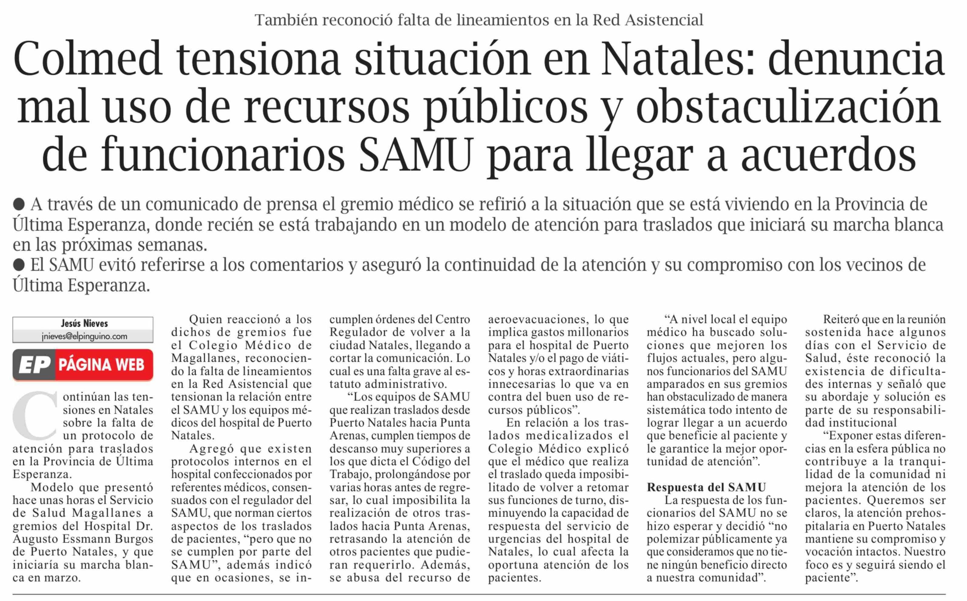 | Título: | Colmed tensiona situación en Natales: denuncia mal uso de recursos públicos y obstaculización de funcionarios SAMU para llegar a acuerdos |