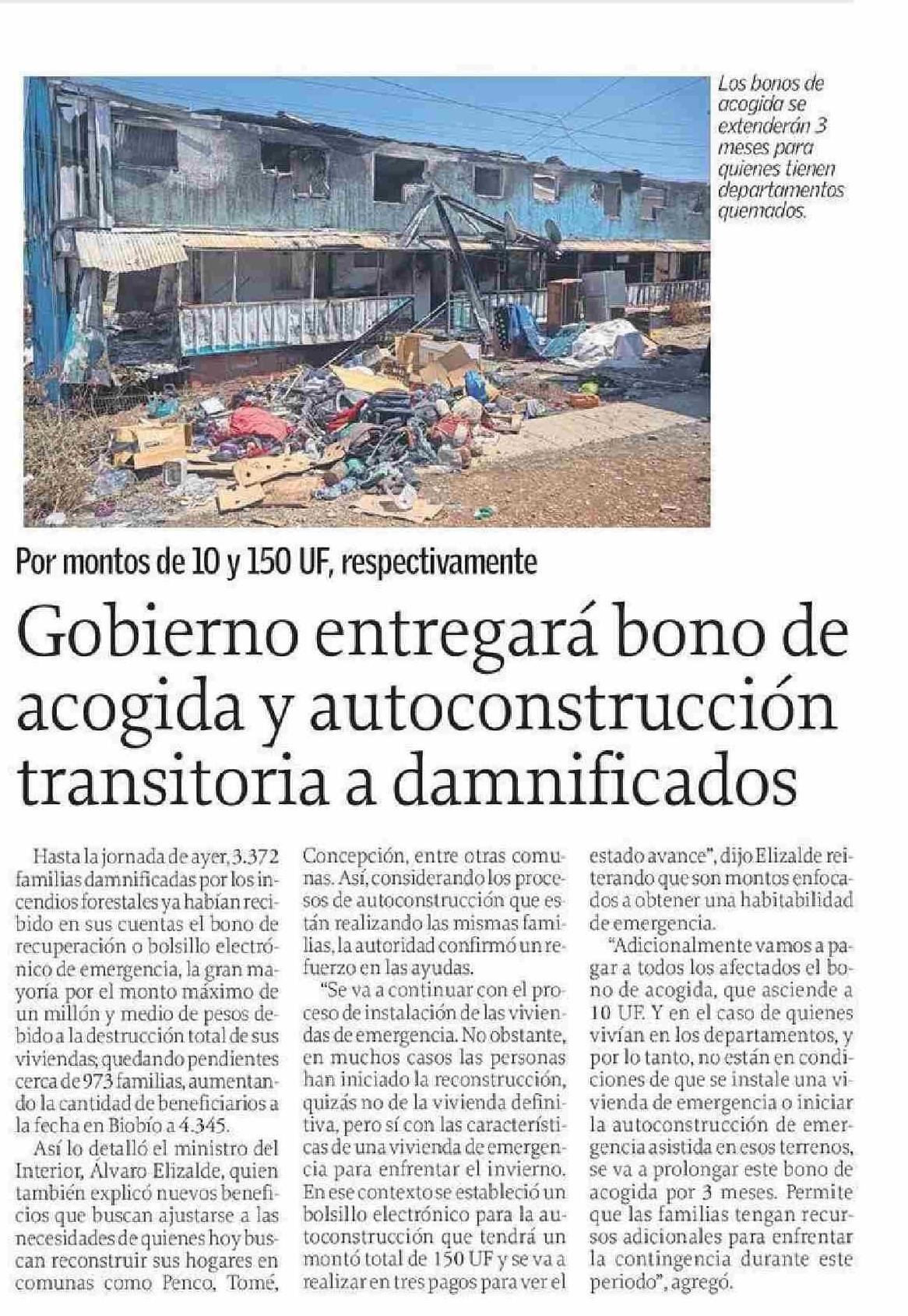 Gobierno entregará bono de acogida y autoconstrucción transitoria a damnificados