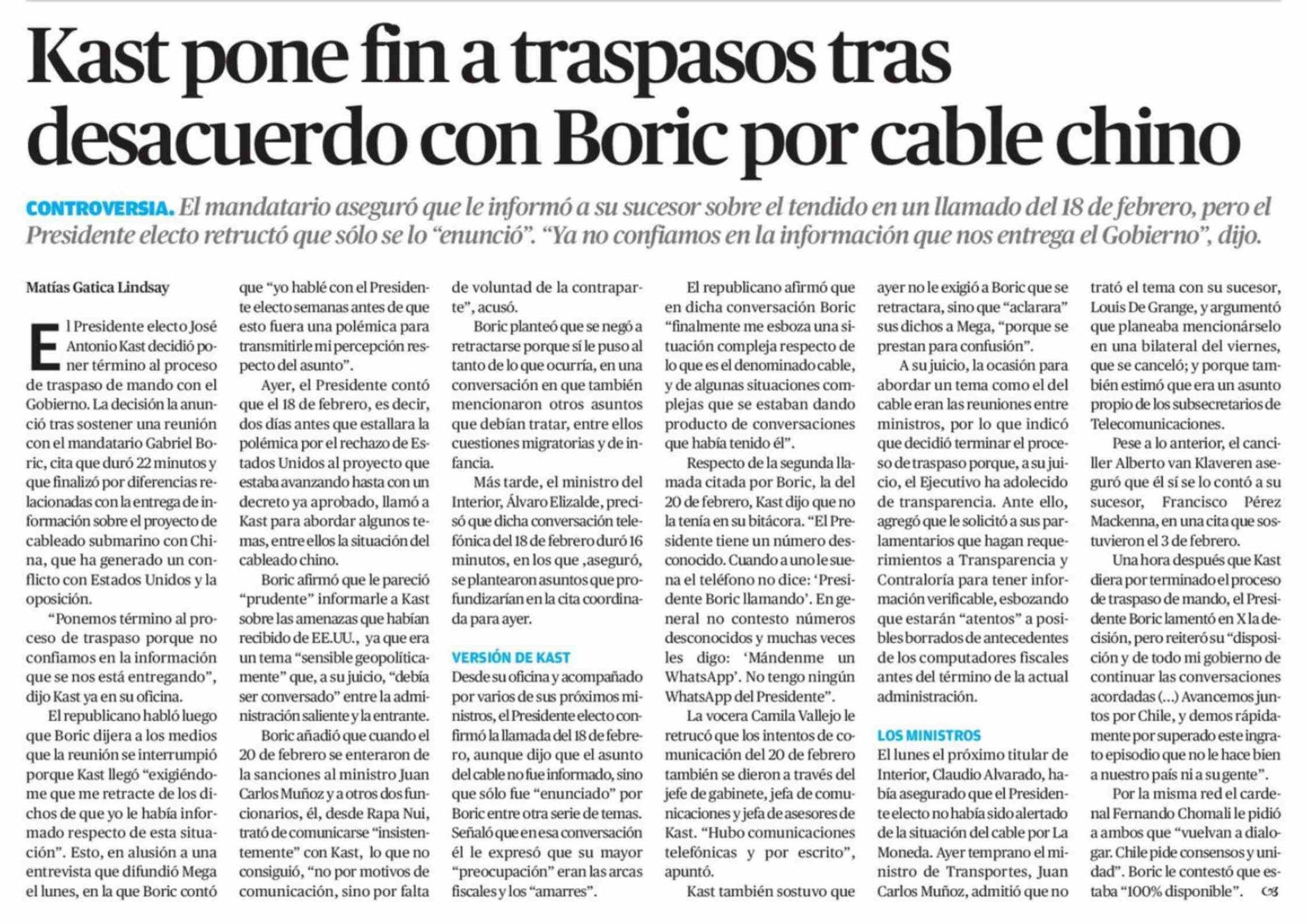 Kast pone fin a traspasos tras desacuerdo con Boric por cable chino
