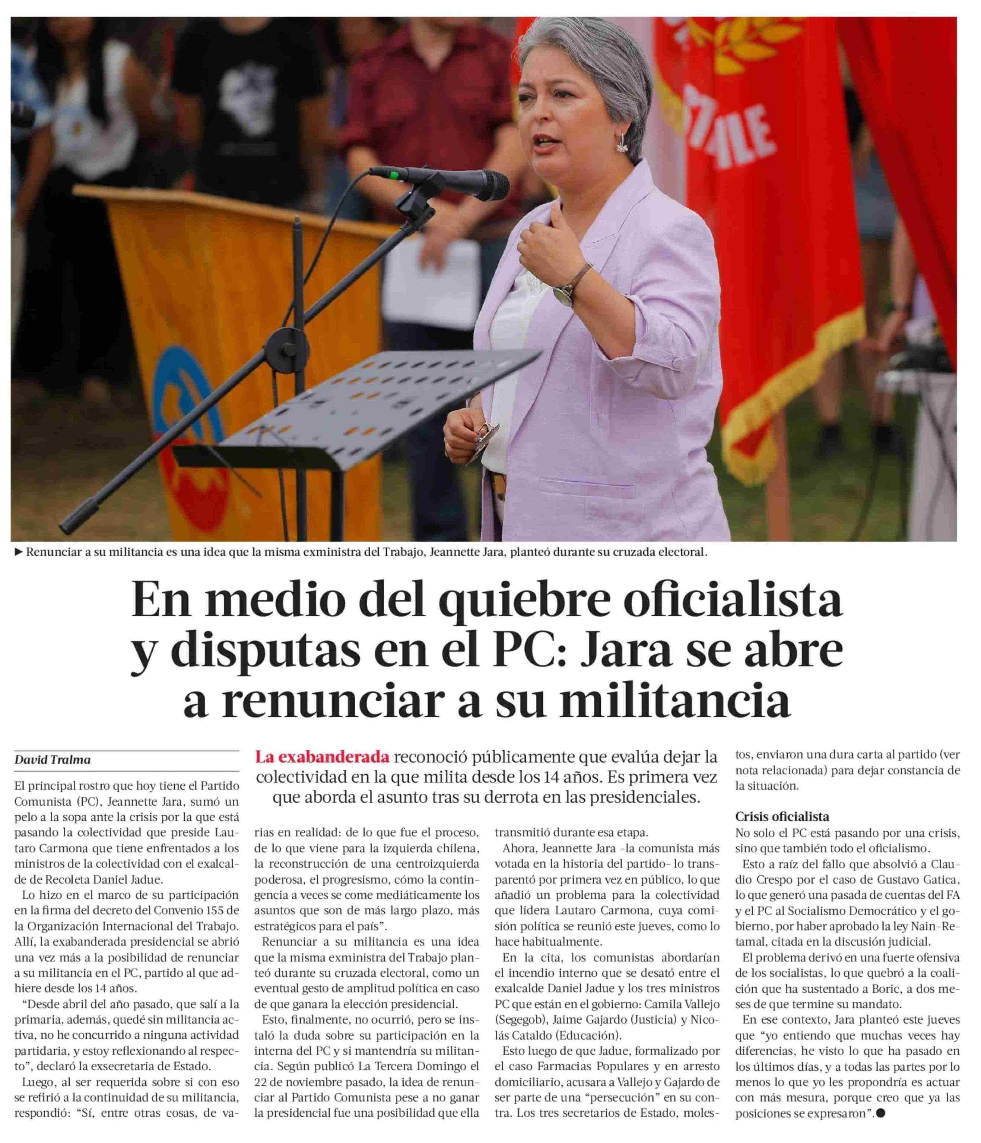 En medio del quiebre oficialista y disputas en el PC: Jara se abre a renunciar a su militancia