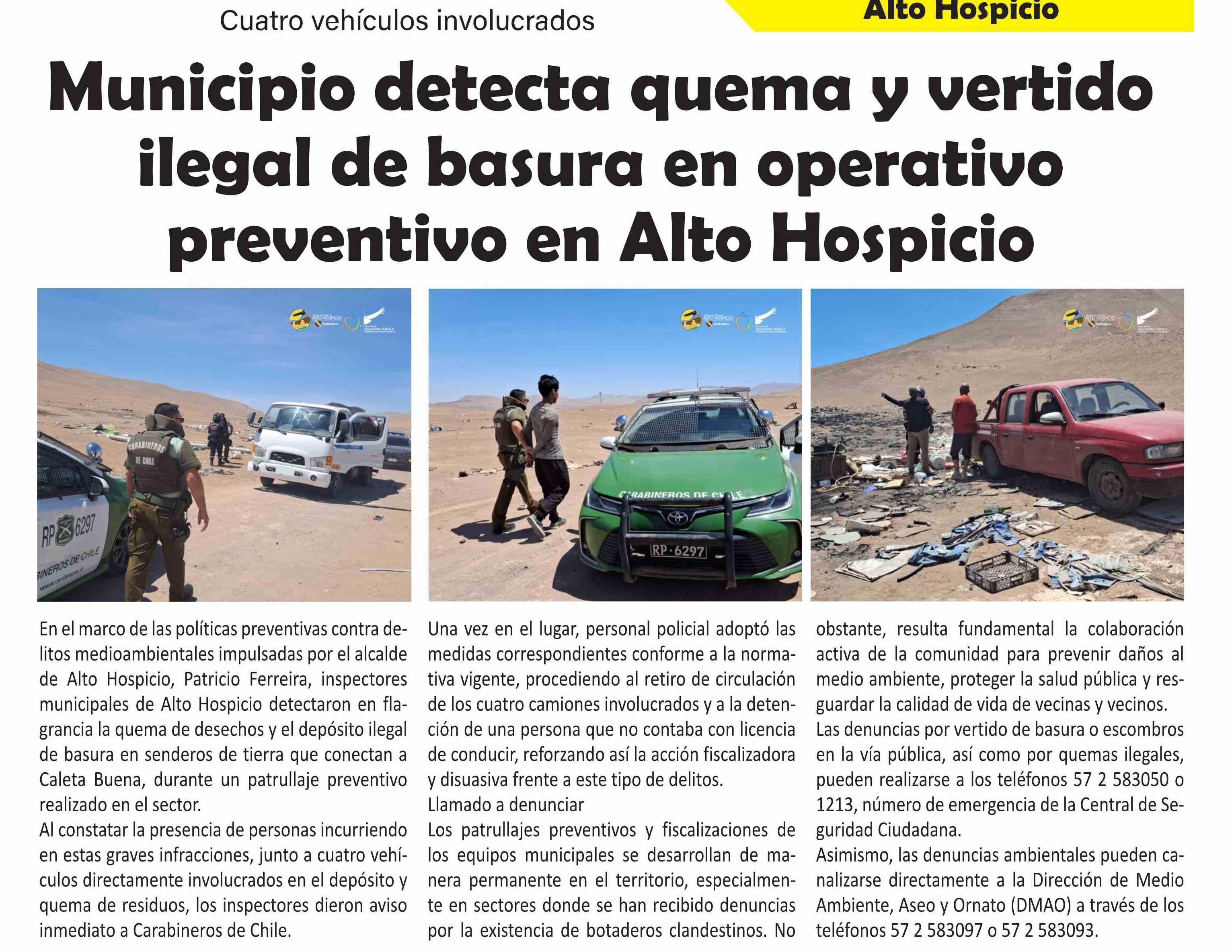 Municipio detecta quema y vertido ilegal de basura en operativo preventivo en Alto Hospicio
