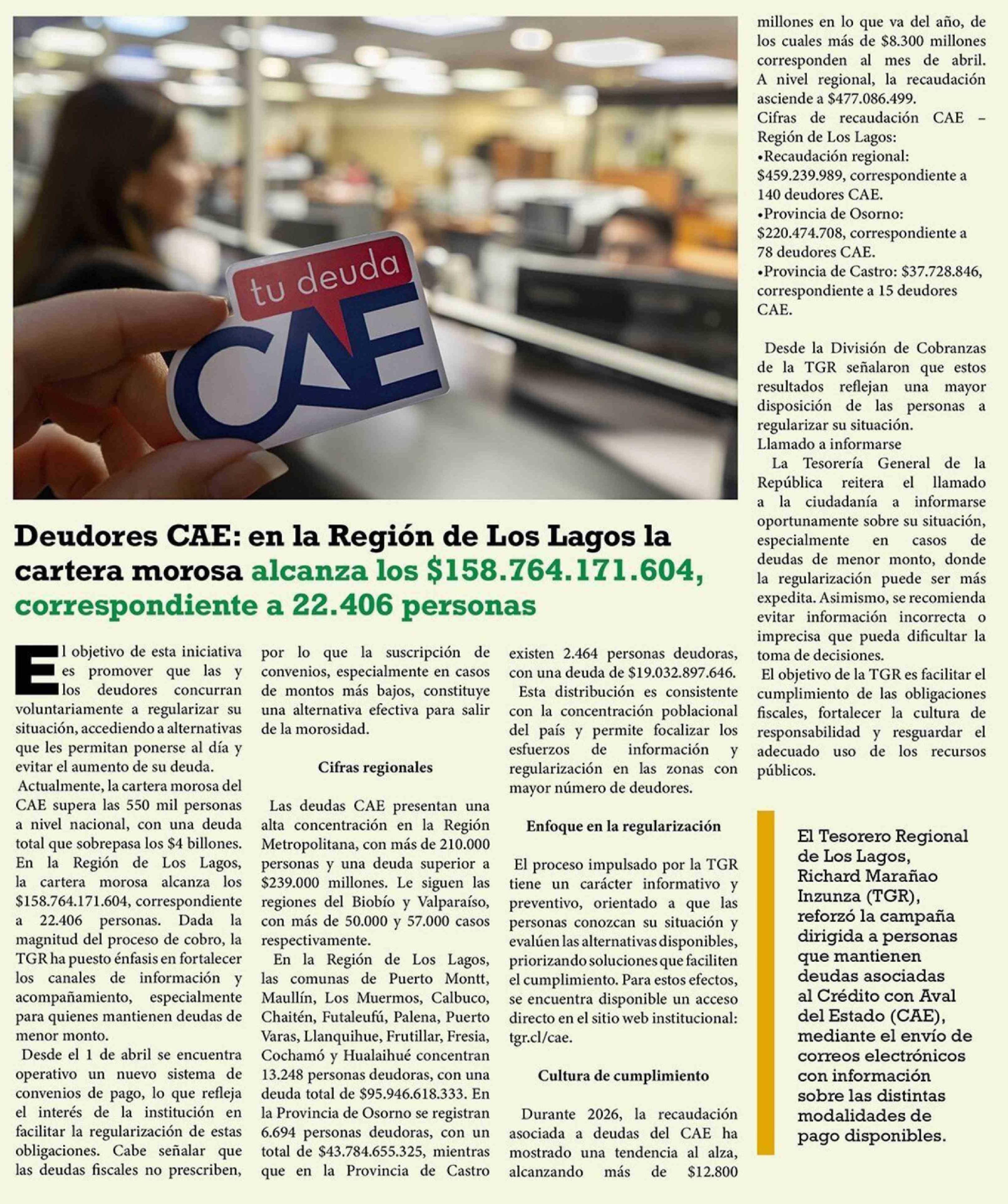 Título: Deudores CAE: en la Region de Los Lagos la cartera morosa alcanza los $158.764.171.604, correspondiente a 22.406 personas