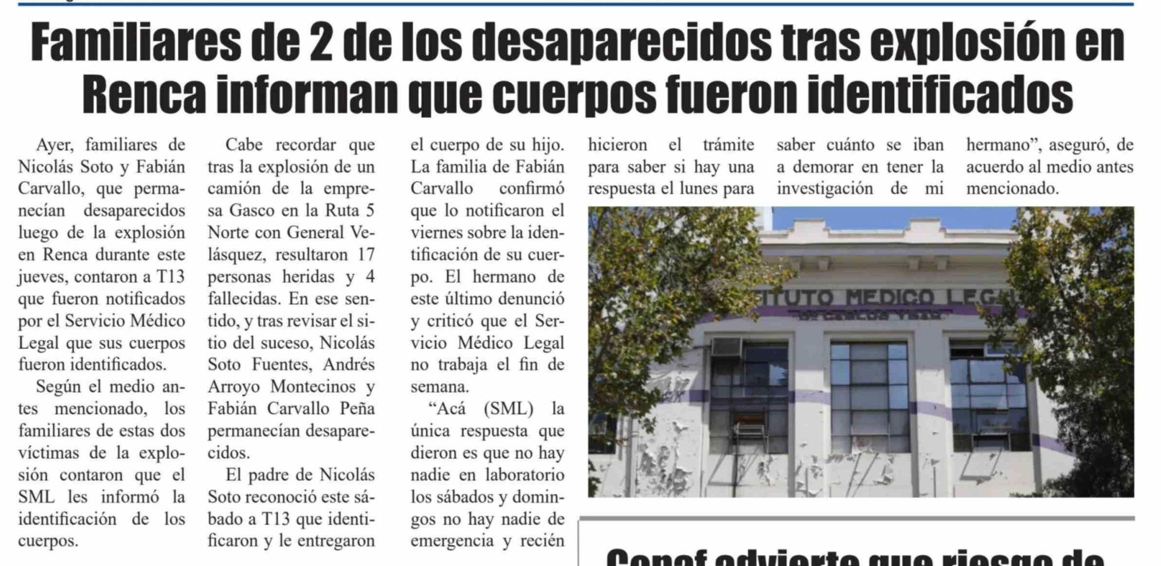 Familiares de 2 de los desaparecidos tras explosión en Renca informan que cuerpos fueron identificados